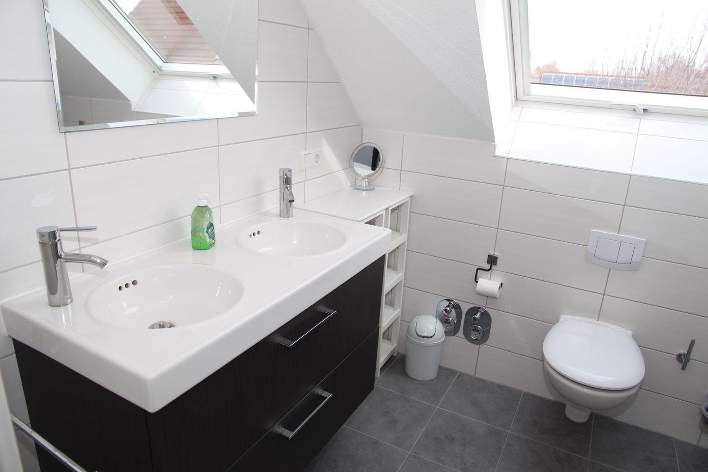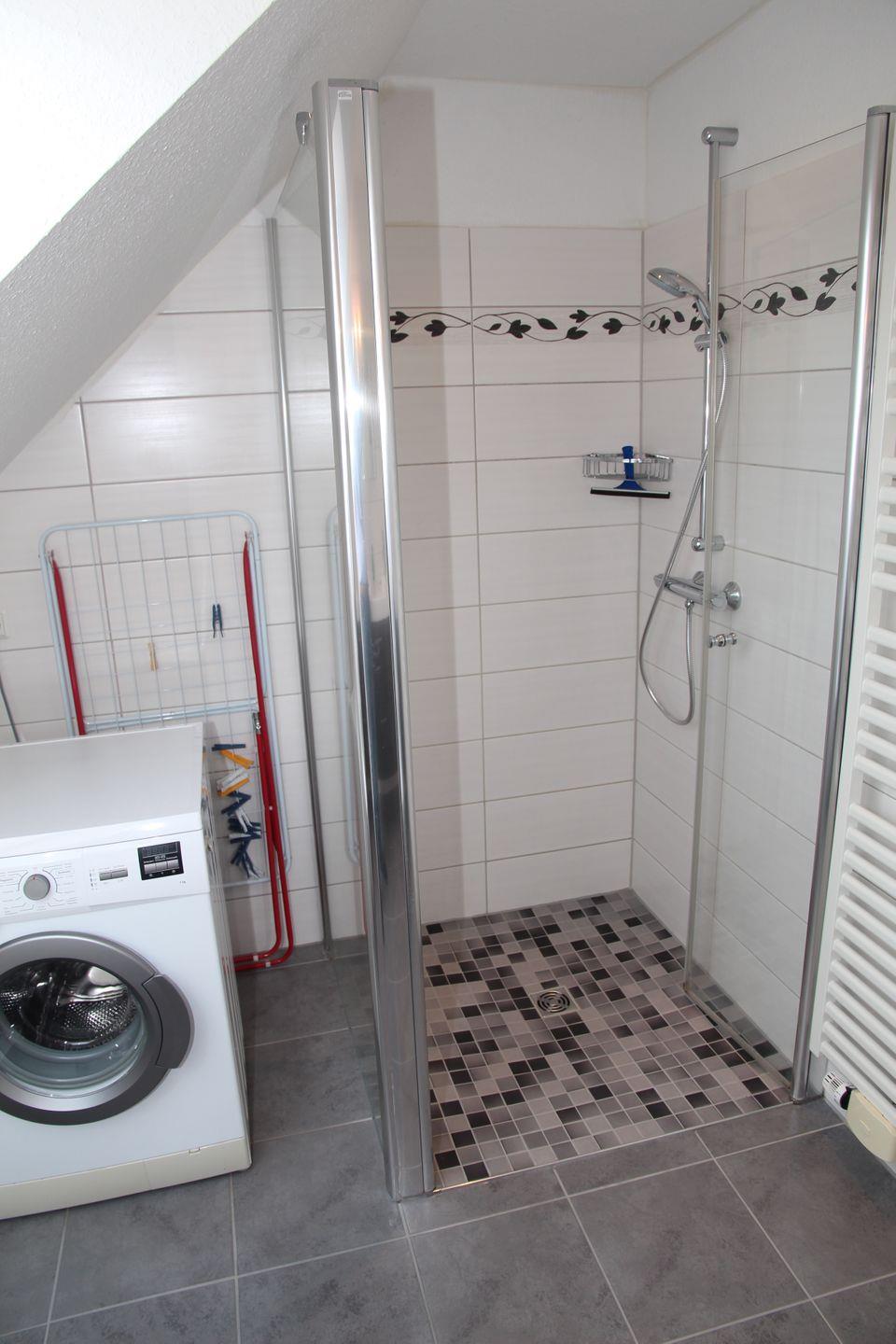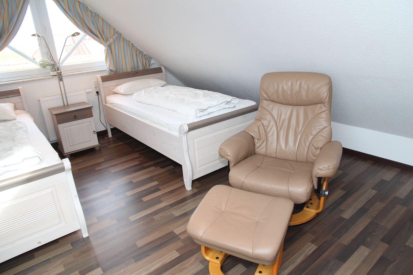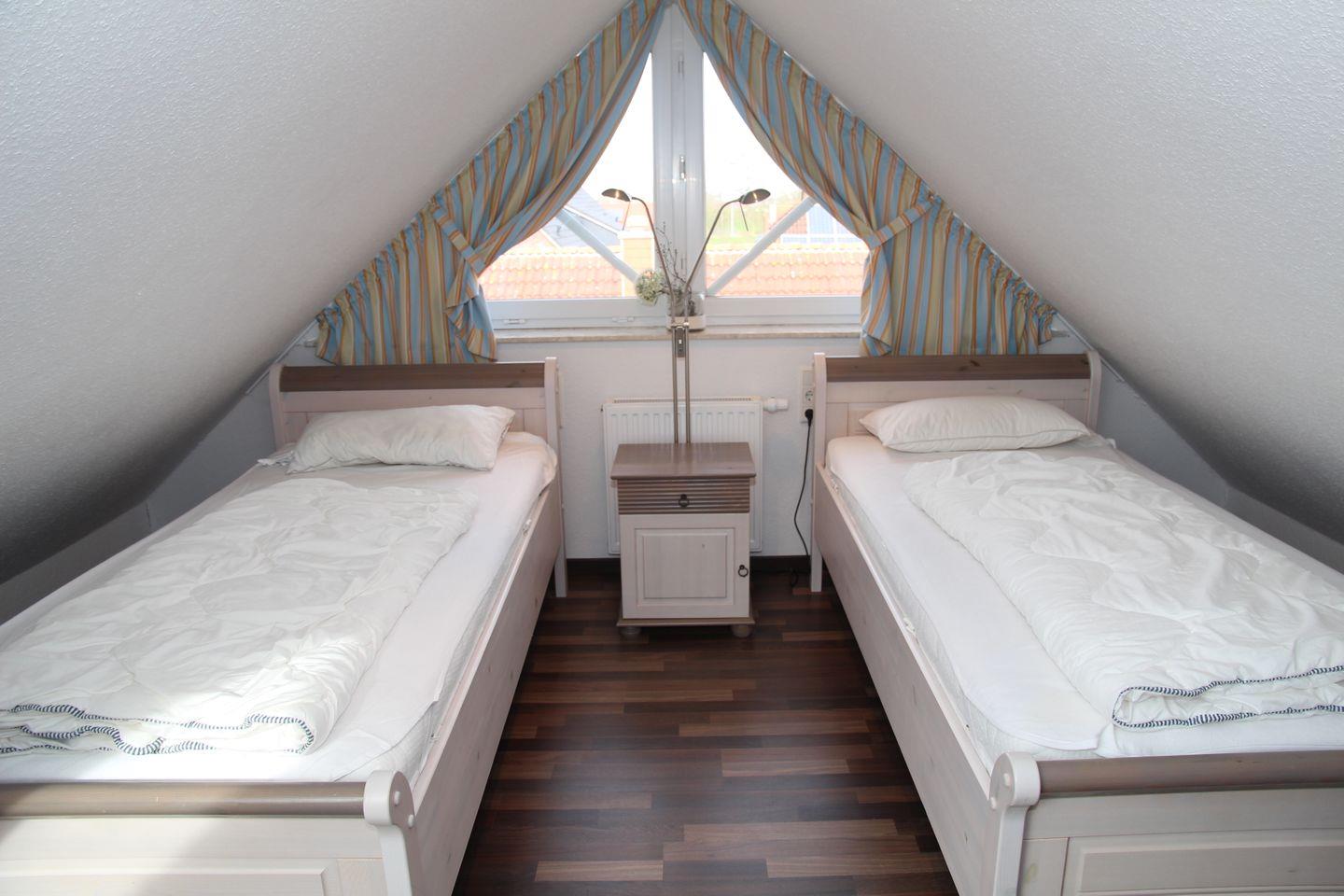 2 Schlafzimmer (1 x mit Doppelbett und Kleiderschrank, 1 x mit 2 Einzelbetten und großem TV im ausgebauten Dachgeschoss mit Tür) sorgen für erholsamen Schlaf. Es gibt ein modernes Bad mit barrierefreier Dusche (Waschmaschine / Fön vorhanden!) und ein sep. Gäste-WC.