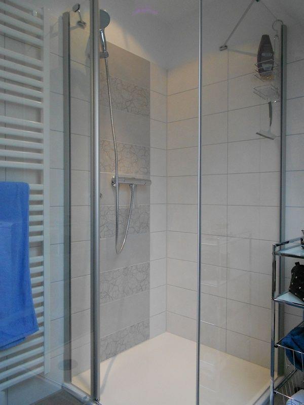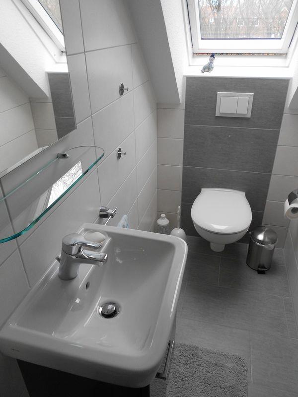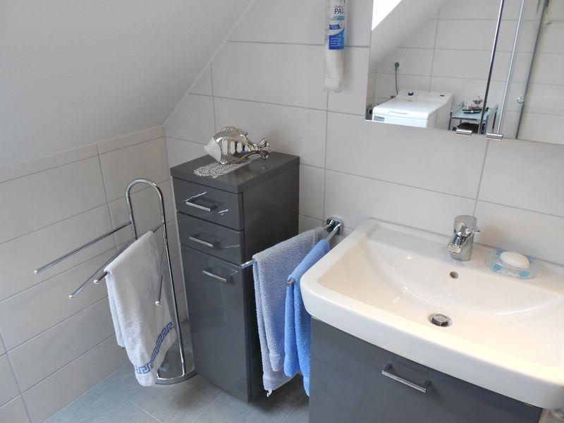 Das Badezimmer ist ausgestattet mit großer Dusche mit niedrigem Einstieg, WC, Waschmaschine, Föhn und Frisierstab. Die Wohnung verfügt über ein separates Gäste-WC.