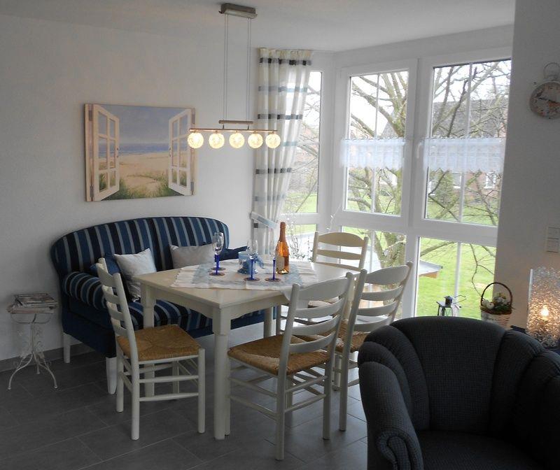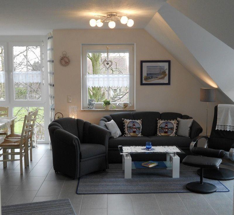 Die Wohnung verfügt über einen großen Wohn-/Essbereich mit Ostfriesensofa und Essgruppe im lichtdurchfluteten Erker. Die gemütliche Sitzecke lädt zum Ausspannen ein. Weiterhin sind ein großer Flachbildschirm und eine Stereoanlage vorhanden. Ein zweiter Flachbildschirm, ein Blu-Ray-Player und ein Radio mit CD befinden sich im ausgebauten Dachgeschoss.