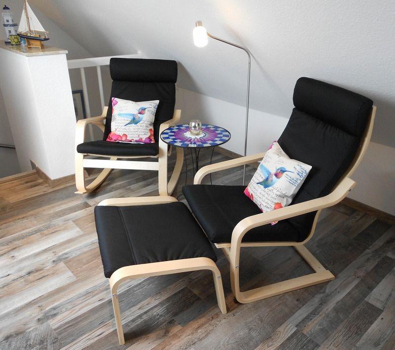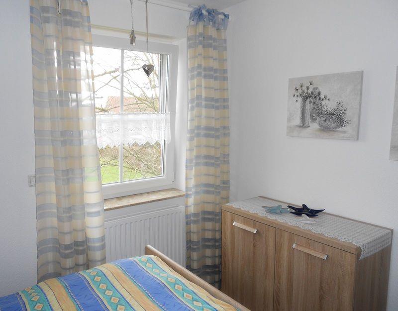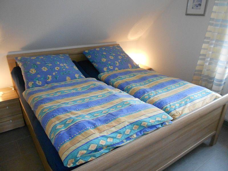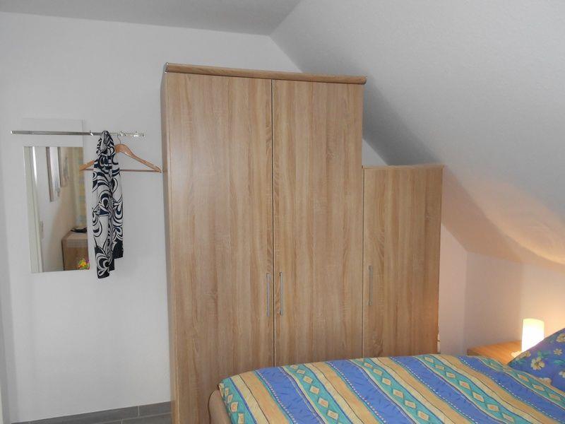 Die Wohnung ist besonders für den Urlaub zu zweit geeignet und wegen des offen ausgebauten Dachgeschosses nur bedingt für 3 Personen. Ein Schlafraum ist mit einem Doppelbett, Kommode und Kleiderschrank ausgestattet. Der zweite Schlafraum im offenen ausgebauten Dachgeschoss verfügt über zwei Einzelbetten, eine gemütliche Sitzecke, einen Schreibplatz, ein Bücherregal mit Büchern und Gesellschaftsspielen und Informationsmaterial zur Region. Ein Kleiderständer ist ebenfalls vorhanden.