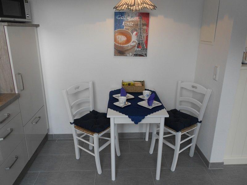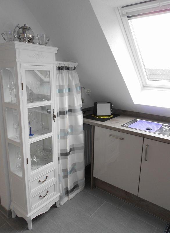 In der vollständig eingerichteten, separaten Küche befinden sich u.a. Ceran-Kochfeld, Backofen, Spülmaschine, Kühlschrank mit Gefrierfach, Kaffeemaschine und Senseo-Pad-Maschine, Toaster, Mikrowelle, Wasserkocher, Eierkocher und Mixer, sowie ausreichend Geschirr. Für das "kleine" Frühstück stehen hier zwei weitere Sitzplätze zur Verfügung. Ein Bügelbrett und Bügeleisen und ein kleiner Wäscheständer sind ebenfalls vorhanden.
