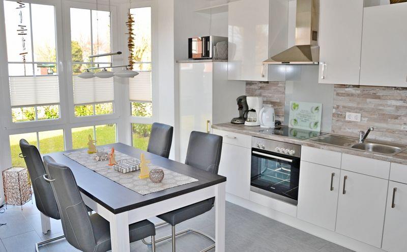 Ein gemütliches Sofa, ein großer SAT-Fernseher (40 Zoll) mit DVD/CD/USB und eine Bücher- und Spielesammlung sorgen für Entspannung und Unterhaltung. Die moderne Küche bietet eine reichhaltige Ausstattung, z. B. Backofen, Mikrowelle, Kühlschrank mit Gefrierfach, Geschirrspülmaschine, Kaffeemaschine und eine Senseo, Toaster, Wasserkocher, Eierkocher, hochwertige Töpfe, Tischgrill und weiteres vielfältiges Koch-und Backgeschirr.