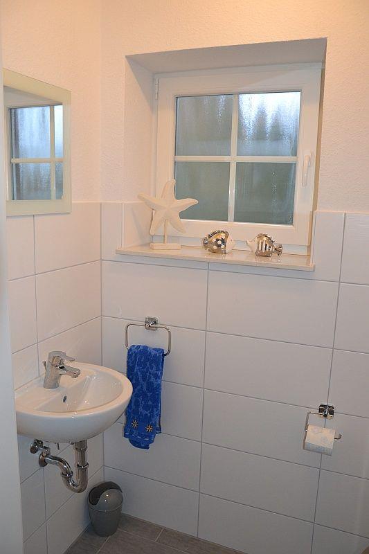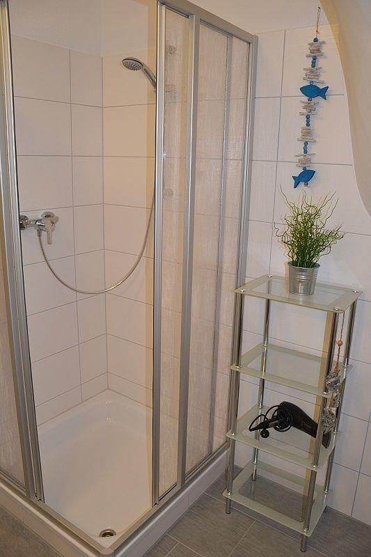 Es gibt ein schönes Duschbad (Dusche mit flachem Einstieg) mit Handtuchheizkörper und Fön. Praktisch ist das zusätzl. Gäste-WC. Waschmaschine, Wäscheständer, Bügeleisen und -brett sind vorhanden.