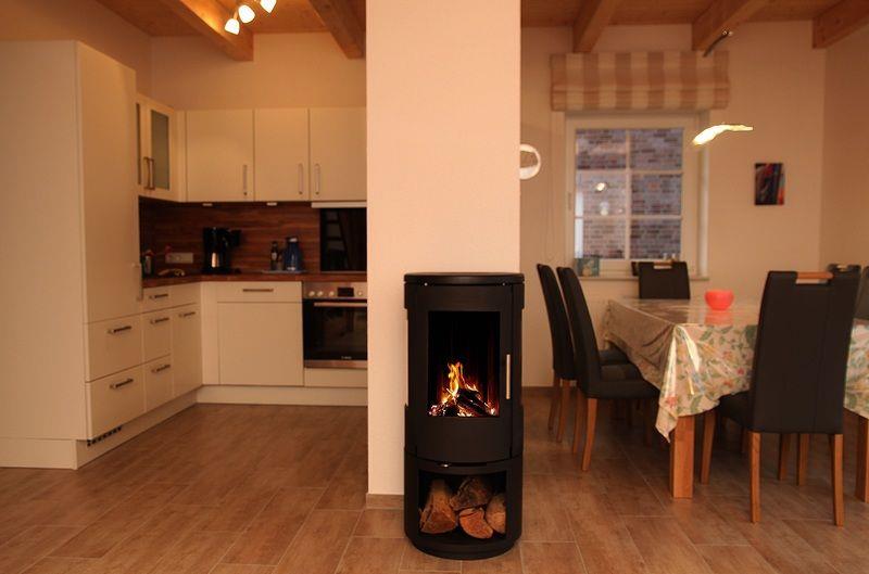 Ein Kamin sorgt für wohlige Wärme im offenen Wohn-Essbereich.