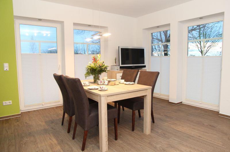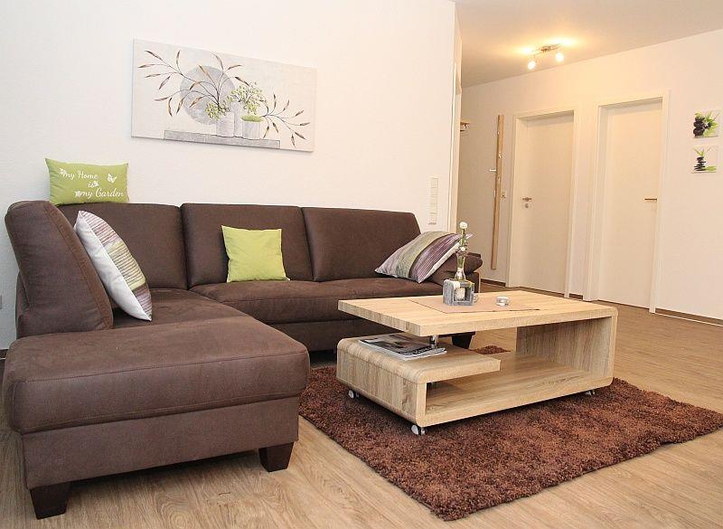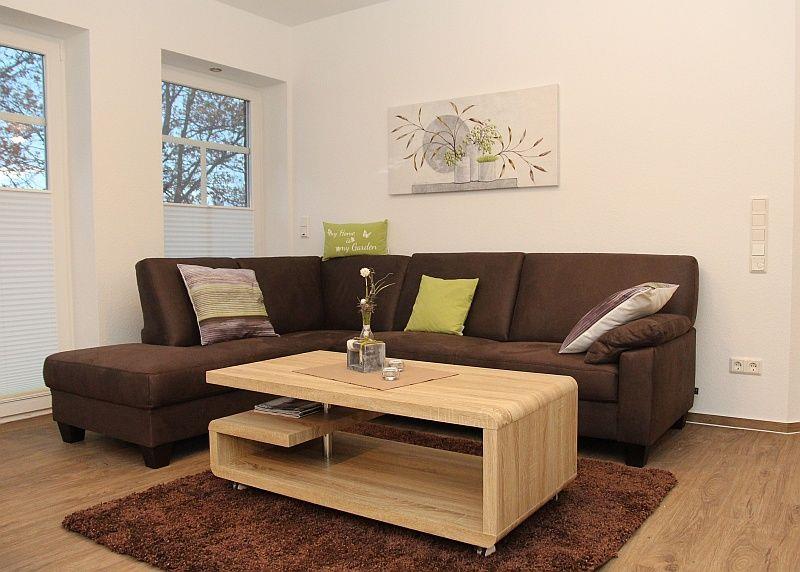 Ein großes Ecksofa und ein Flachbildschirm (SAT-TV) (mit USB-Stick-Funktion) laden zum Relaxen ein. Ein transportables Radio-Gerät ist ebenfalls vorhanden.