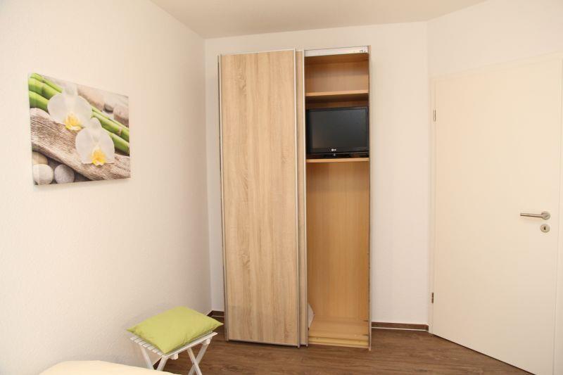 Ein Schlafraum ist mit einem Doppelbett (180 x 200 cm), der andere Schlafraum mit 2 Einzelbetten (90 x 200 cm) und jeweils mit einem weiteren TV ausgestattet. Hier gibt es Verdunklungsplissees, sowie Außenrollos.