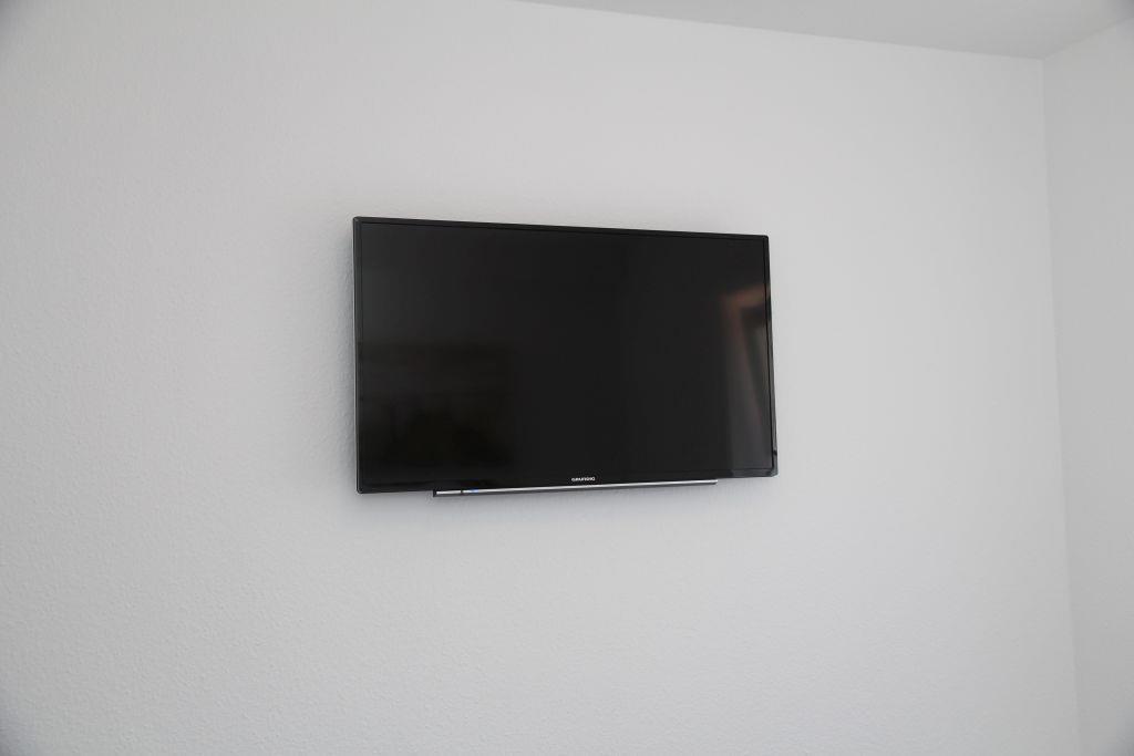 Eine gemütliche Couchgarnitur im großzügigen Wohnbereich mit großem Fernseher, eine Musik- und Radioanlage.