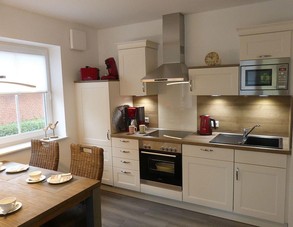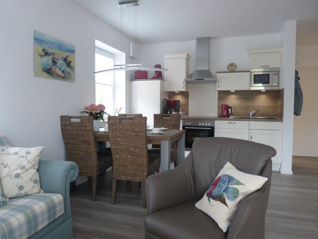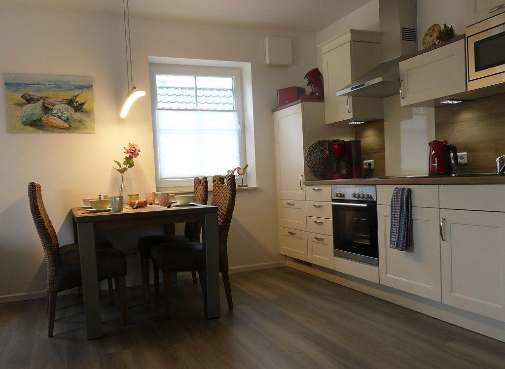 Der große Wohn-Essbereich bietet Platz für 4 Personen und verfügt neben Couchtisch und Sideboard über eine bequeme Couch, einen Ledersessel und einen Fernseher mit 43 Zoll Bildschirm. Die moderne Landhausküche ist mit allem ausgestattet, was Ihr Urlauberherz begehrt (Geschirrspülmaschine, Cerankochfeld, Backofen, Kaffeemaschine, Senseopadmaschine, Kühlschrank mit Gefrierfach, Eierkocher, Wasserkocher, Toaster u.v.m.), sogar ein Teegeschirr und Espressotassen mit Desserttellern sind vorhanden. An dem Esstisch finden 4 Personen bequem Platz, um Mahlzeiten einzunehmen oder Spieleabende zu veranstalten.
