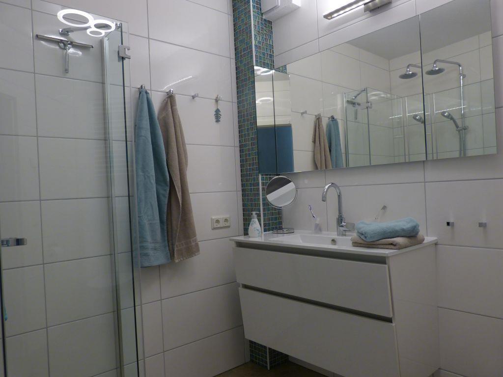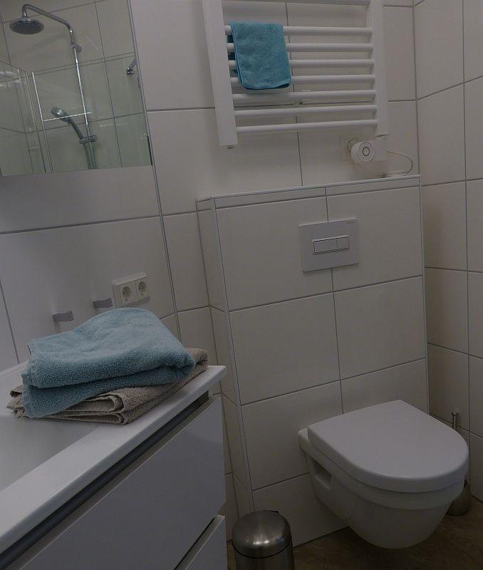 Das moderne Badezimmer ist mit einer ebenerdigen Dusche, einem Handtuchtrockner, einem Föhn, Vergrößerungsspiegel und viel Stauraum ausgestattet. Ein Gäste-WC ist zusätzlich vorhanden.