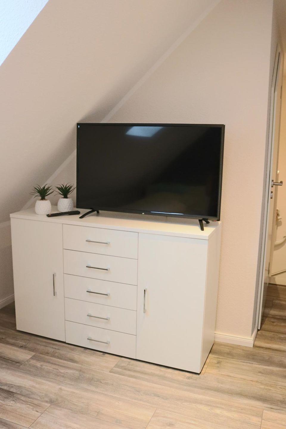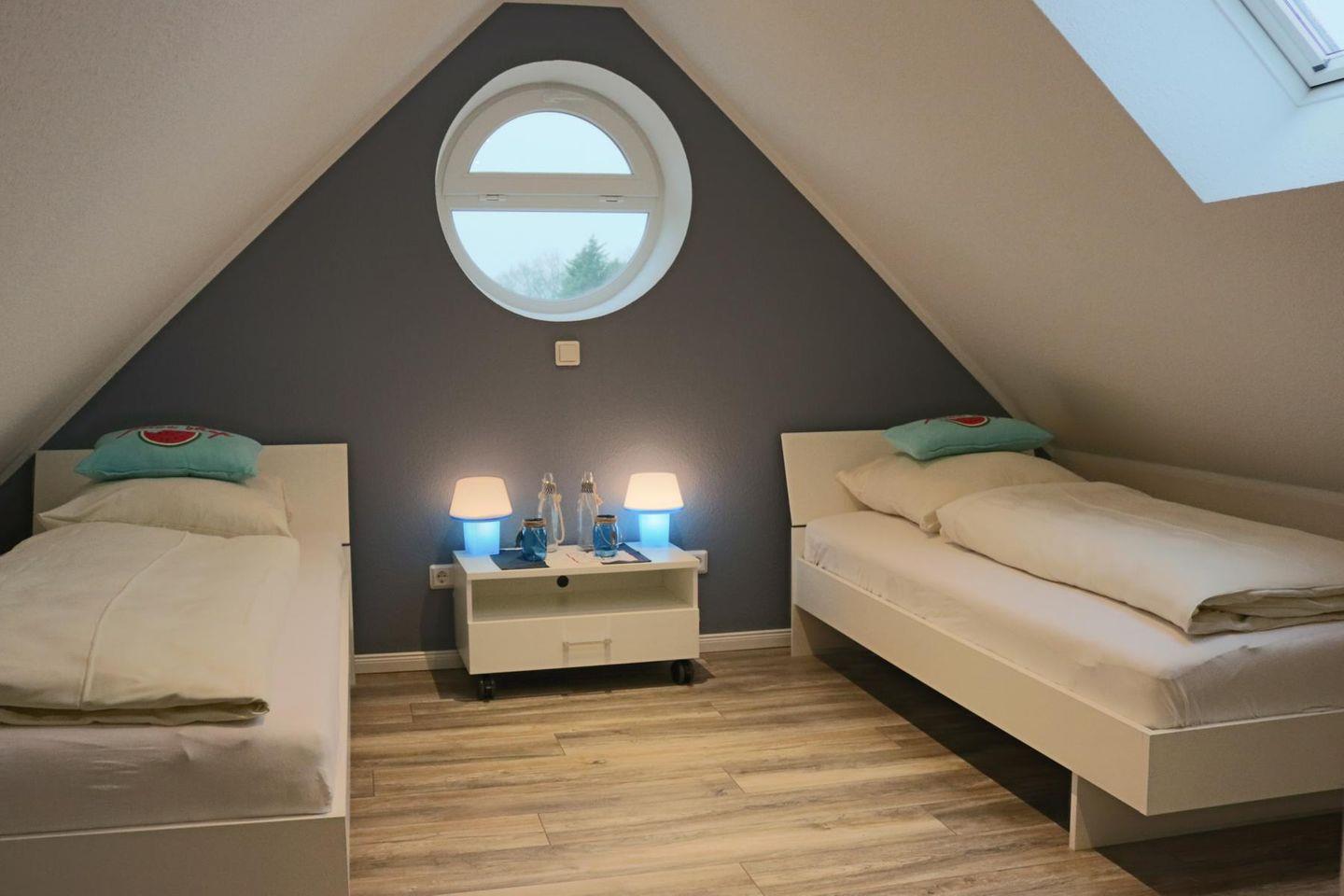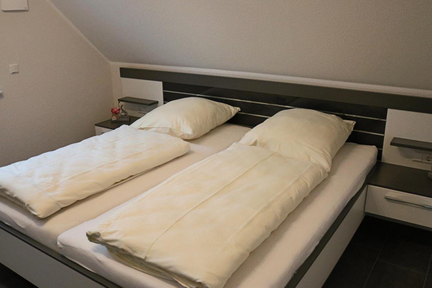 Die Wohnung verfügt über zwei Schlafzimmer, eines im OG mit komfortablem Doppelbett und Kleiderschrank, ein weiteres mit 2 Einzelbetten und Smart-TV im ausgebauten Dachgeschoss.