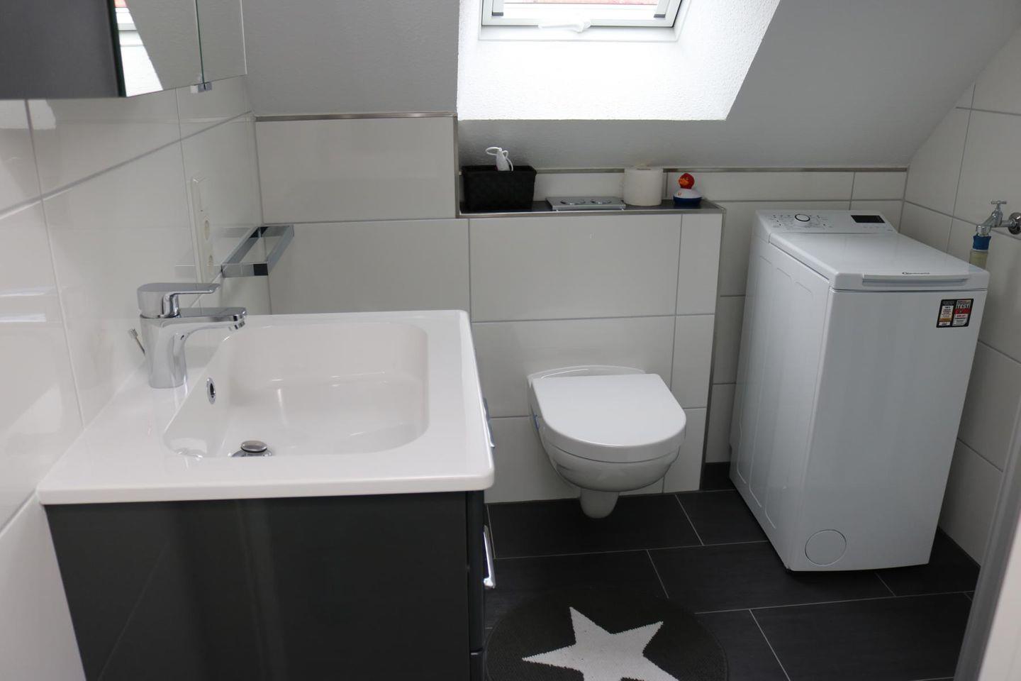 Es gibt ein modernes Tageslichtbad mit bodentiefer Dusche und Fön, auch eine Waschmaschine ist hier vorhanden.