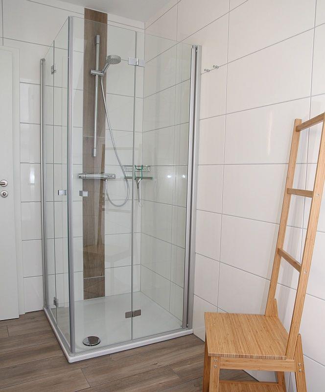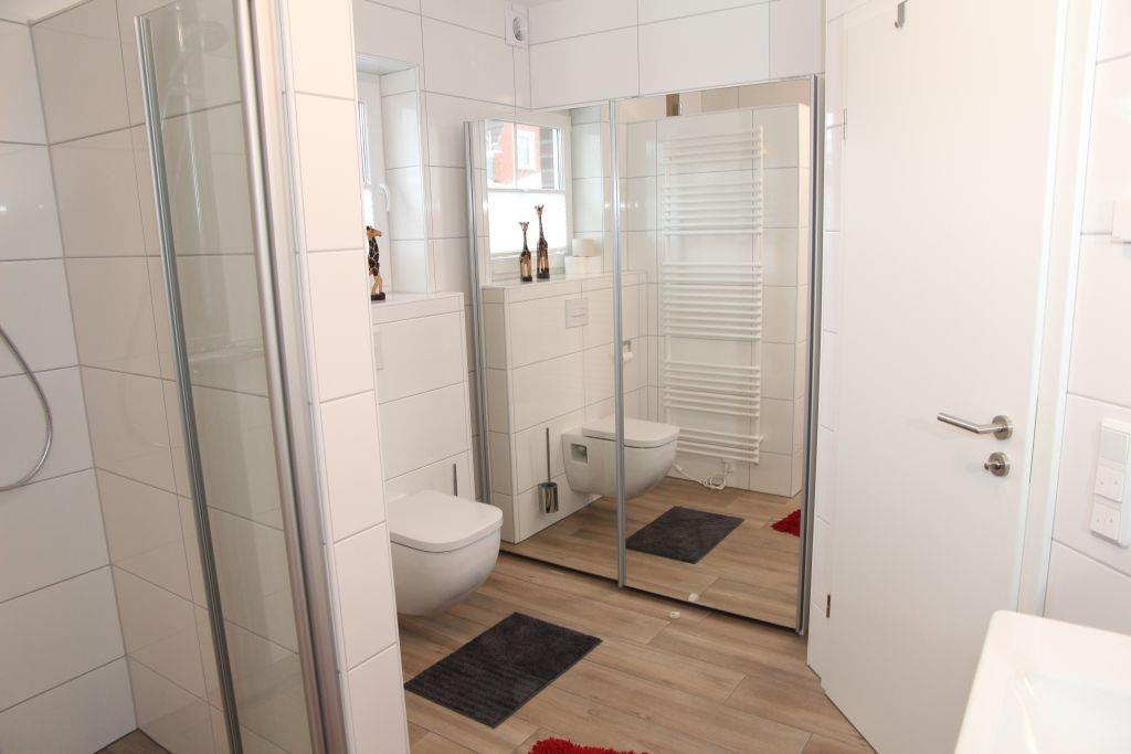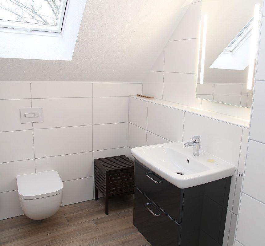 Ein Kamin sorgt für wohlige Wärme im offenen Wohn-Essbereich. Im großen Badezimmer im Erdgeschoss befindet sich eine ebenerdige Dusche und ein großer Spiegelschrank mit ausreichend Ablagefläche, hier befinden sich auch die Waschmaschine und der Trockner. Ein Schlafzimmer befindet sich im EG, zwei weitere Schlafzimmer und ein Dusch- Bad befinden sich im OG.