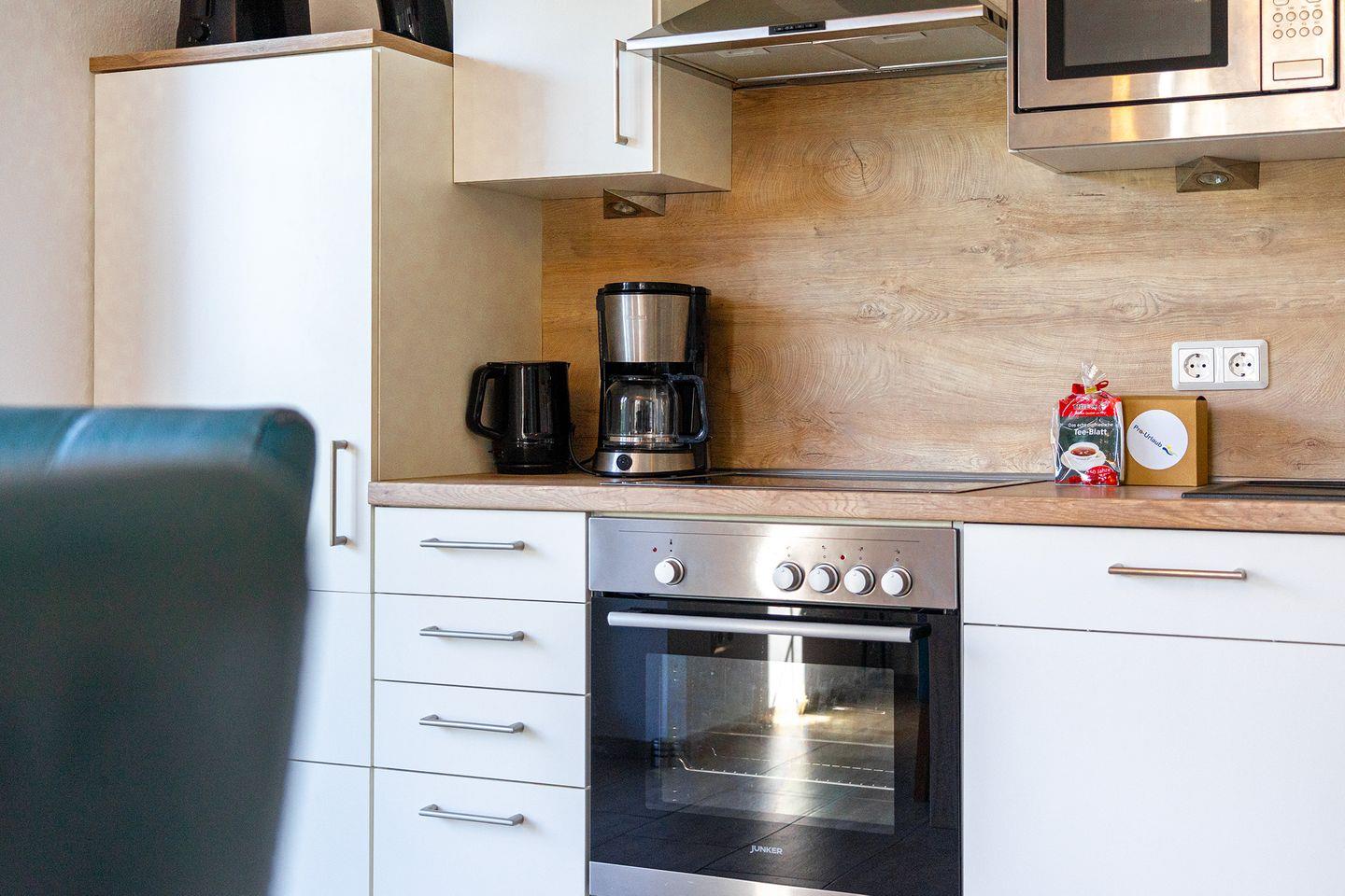 Die umfangreiche Küchenausstattung umfasst Herd mit Ceranfeld, Backofen, Mikrowelle, Spülmaschine, Kühlschrank mit Gefrierfach, Kaffeemaschine, Senseo, Wasserkocher, Toaster, Mixer, hochwertiges Topfset u.v.m.
