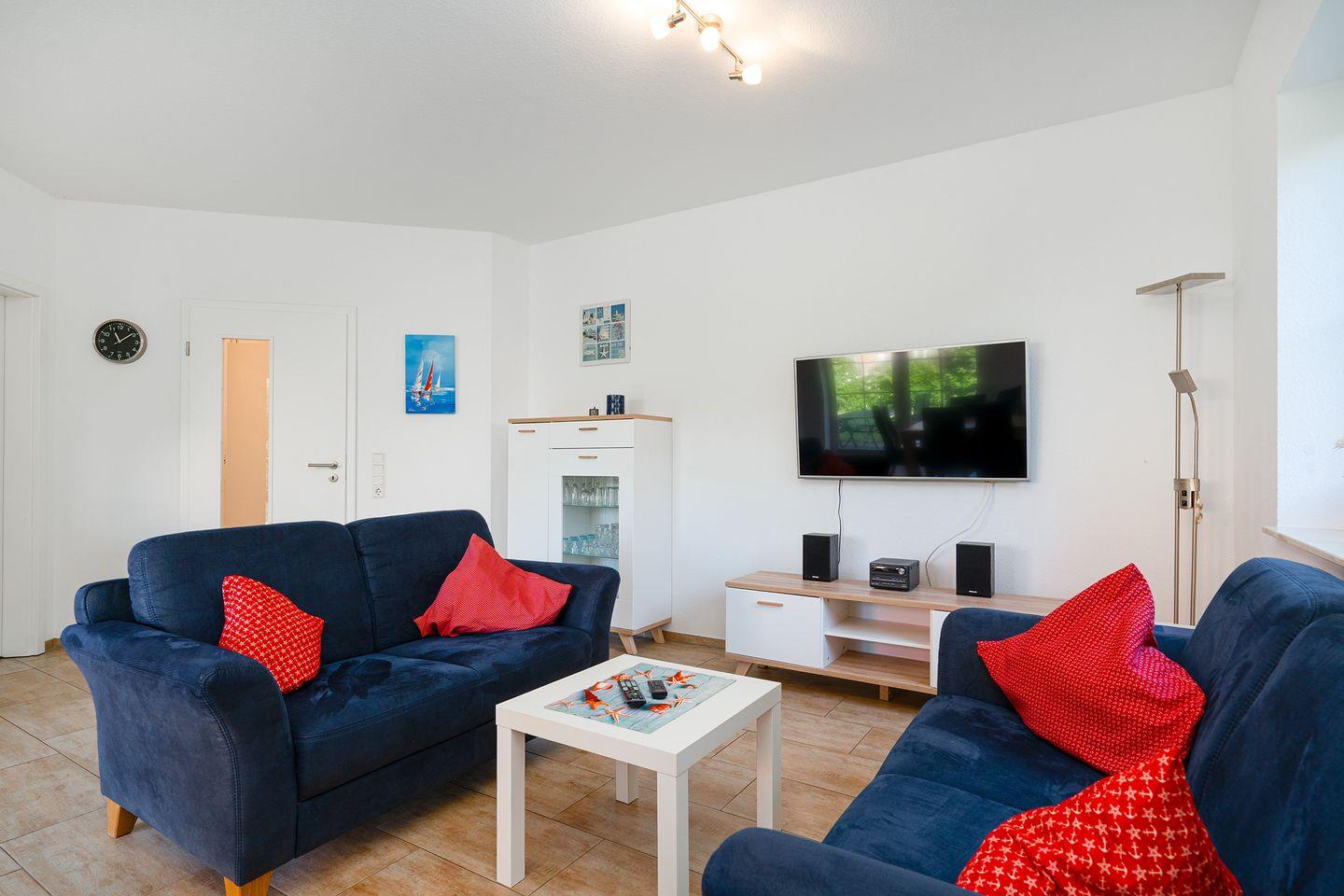 Der geräumige Wohn-/Essbereich mit integrierter Küche ist mit einem komfortablen Esstisch, zwei gemütlichen Sofas sowie einem großen Flachbild-TV, Radio mit USB-Anschluss und WLAN ausgestattet. Eine Spielesammlung lädt ein zum geselligen Beisammensein.