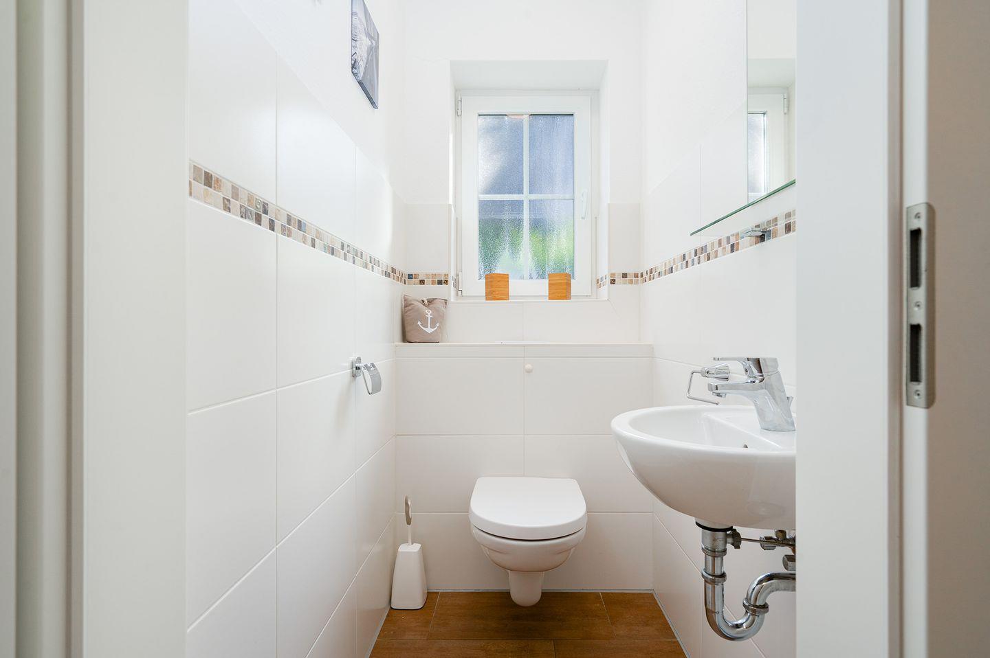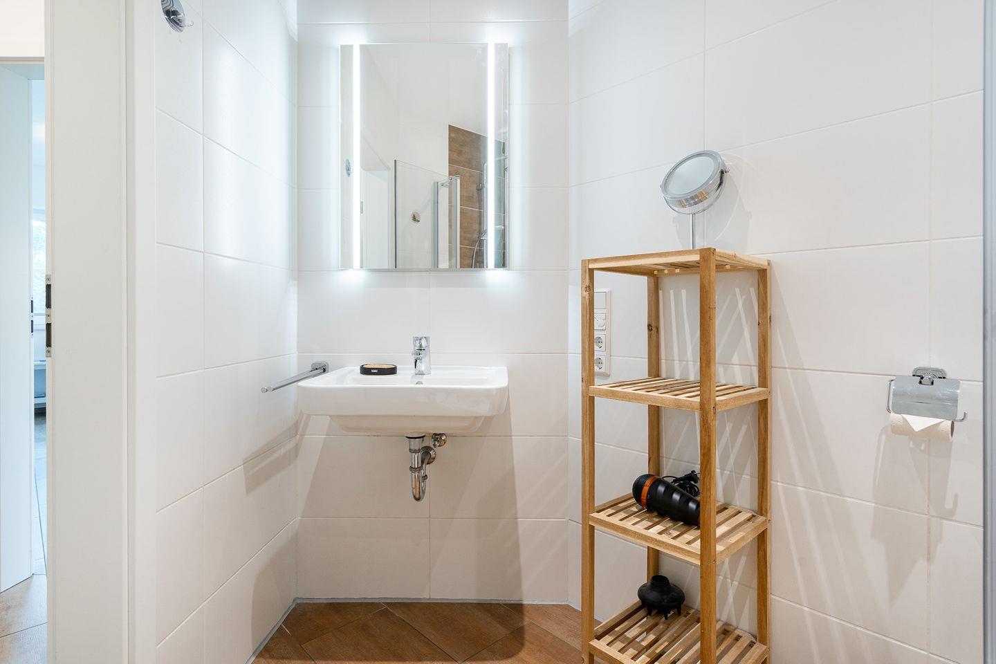 Das moderne Bad ist mit einer ebenerdigen Regendusche und Ganzglasduschtür ausgestattet. Ein Fön ist ebenfalls vorhanden. Zusätzlich gibt es ein separates Gäste-WC mit Waschbecken.