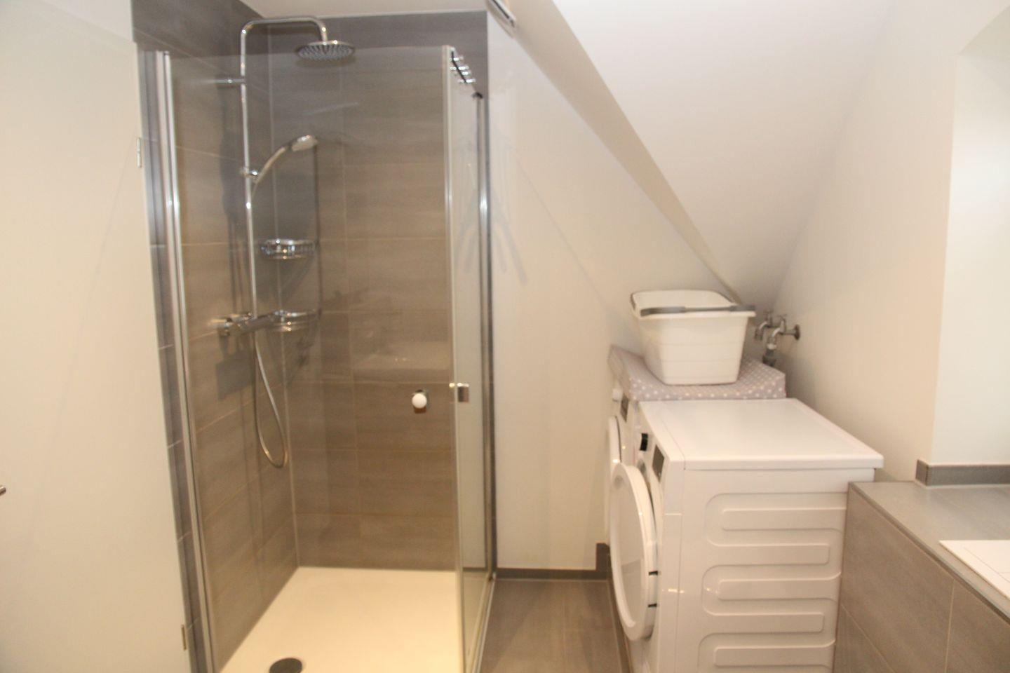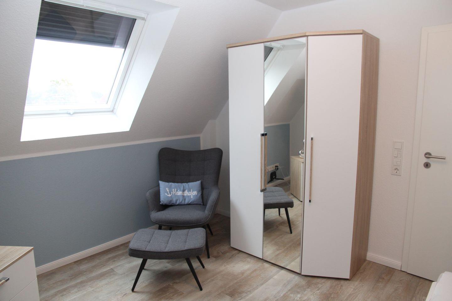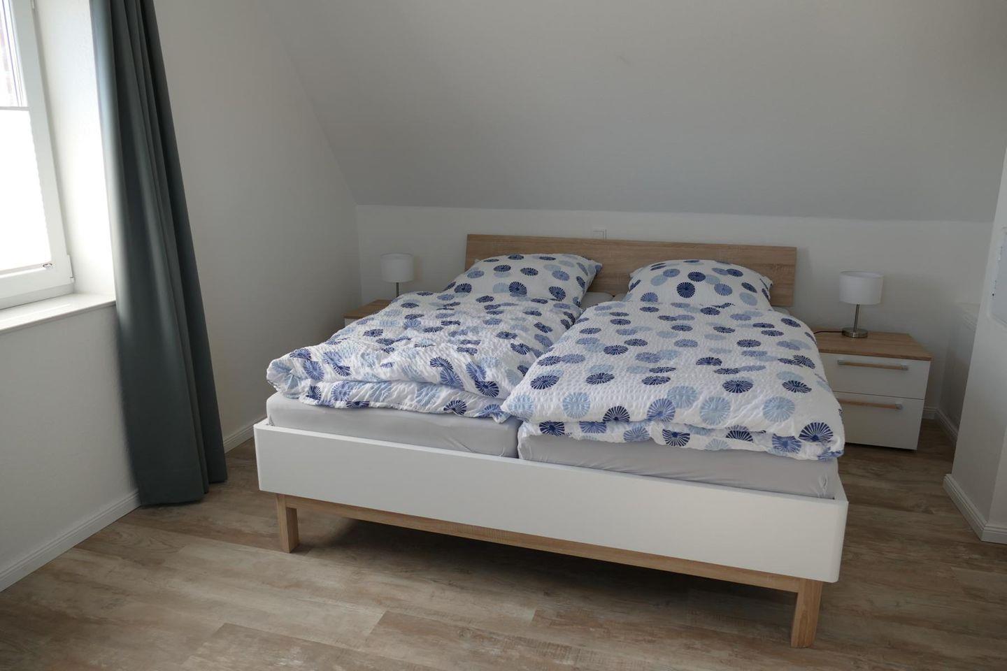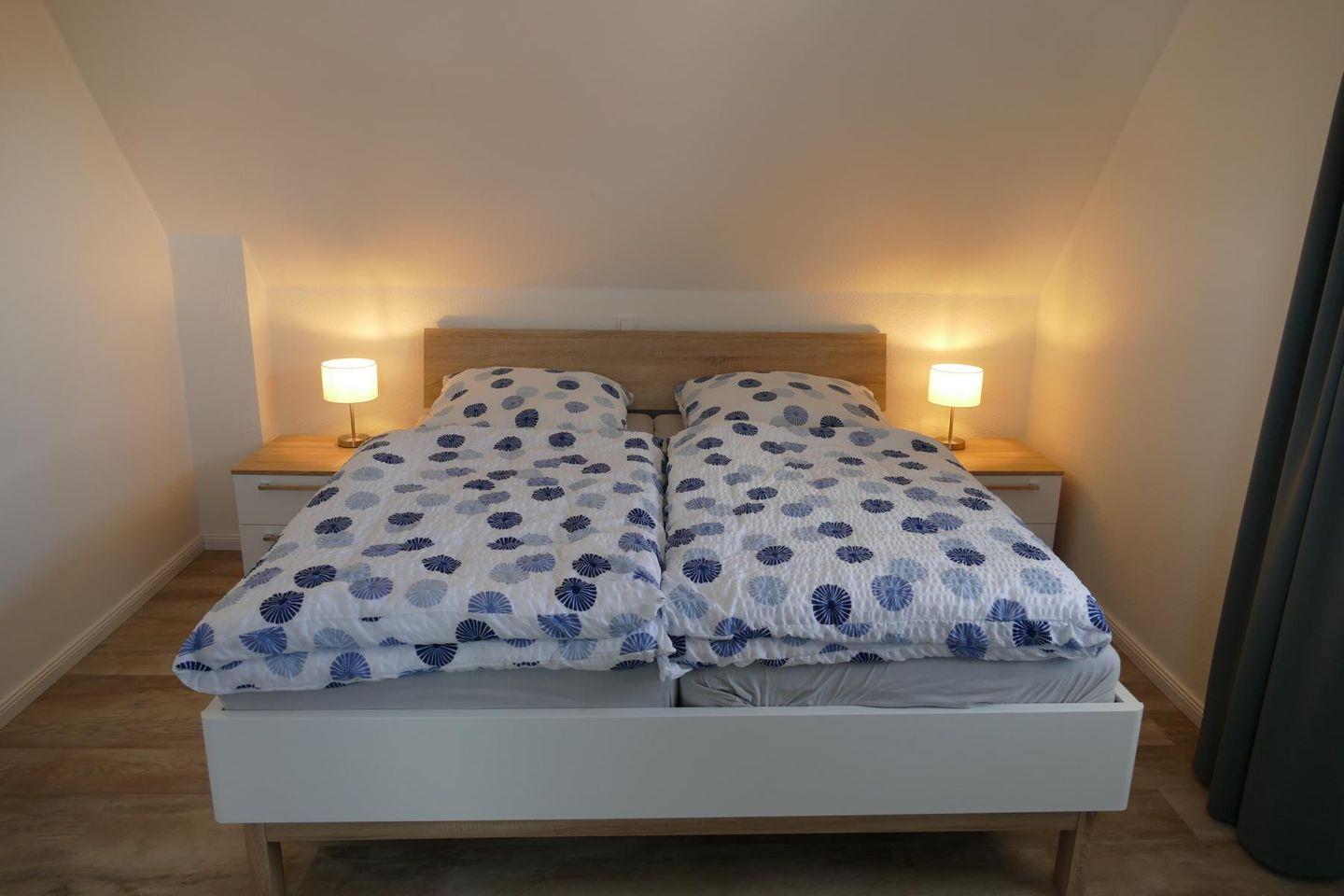 Im Obergeschoss sind zwei gemütliche Schlafzimmer (beide mit Doppelbett und Kleiderschrank) sowie ein weiteres Badezimmer mit Dusche, Babybadewanne, Wickelauflage, Waschmaschine und Trockner.