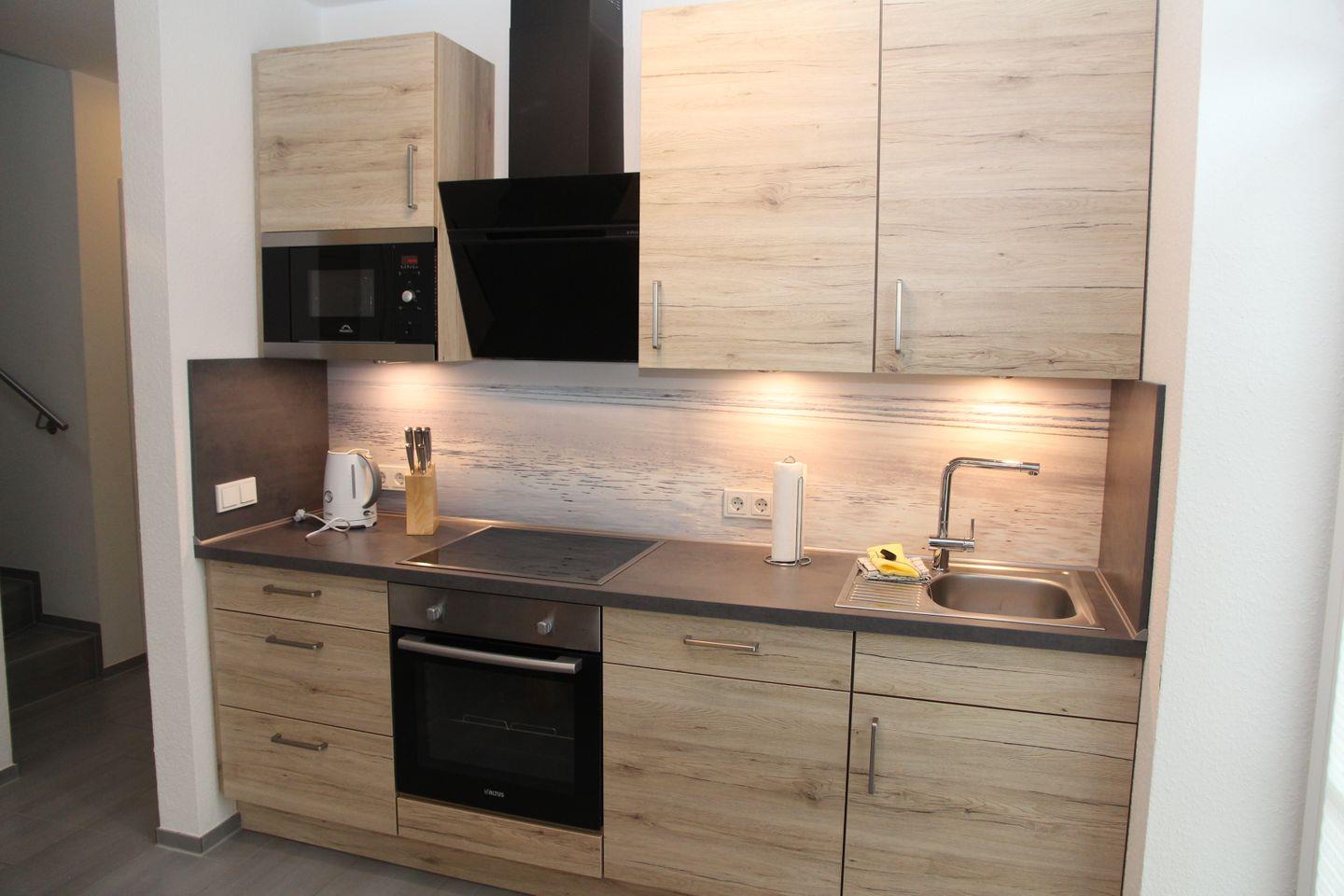Im Erdgeschoss befindet sich ein Wohn-Essbereich mit moderner, komplett ausgestatteter Küche mit Geschirrspülmaschine, Kühlschrank, separatem Gefrierfach, Mikrowelle, Cerankochfeld mit Induktion, Wasserkocher, Kaffeemaschine, Padmaschine (Tassimo/Bosch), Toaster, Mixer, Eierkocher u.v.m. Ein großer Esstisch mit 6 Stühlen sowie ein Kinderhochstuhl stehen für gemütliche Familienzusammenkünfte zur Verfügung. Der Kaminofen lädt zu gemütlichen Abenden und ruhigen Stunden ein. Im EG ist weiterhin ein kleines Badezimmer mit Dusche sowie ein kleines Schlafzimmer mit zwei Einzelbetten und Kleiderschrank.