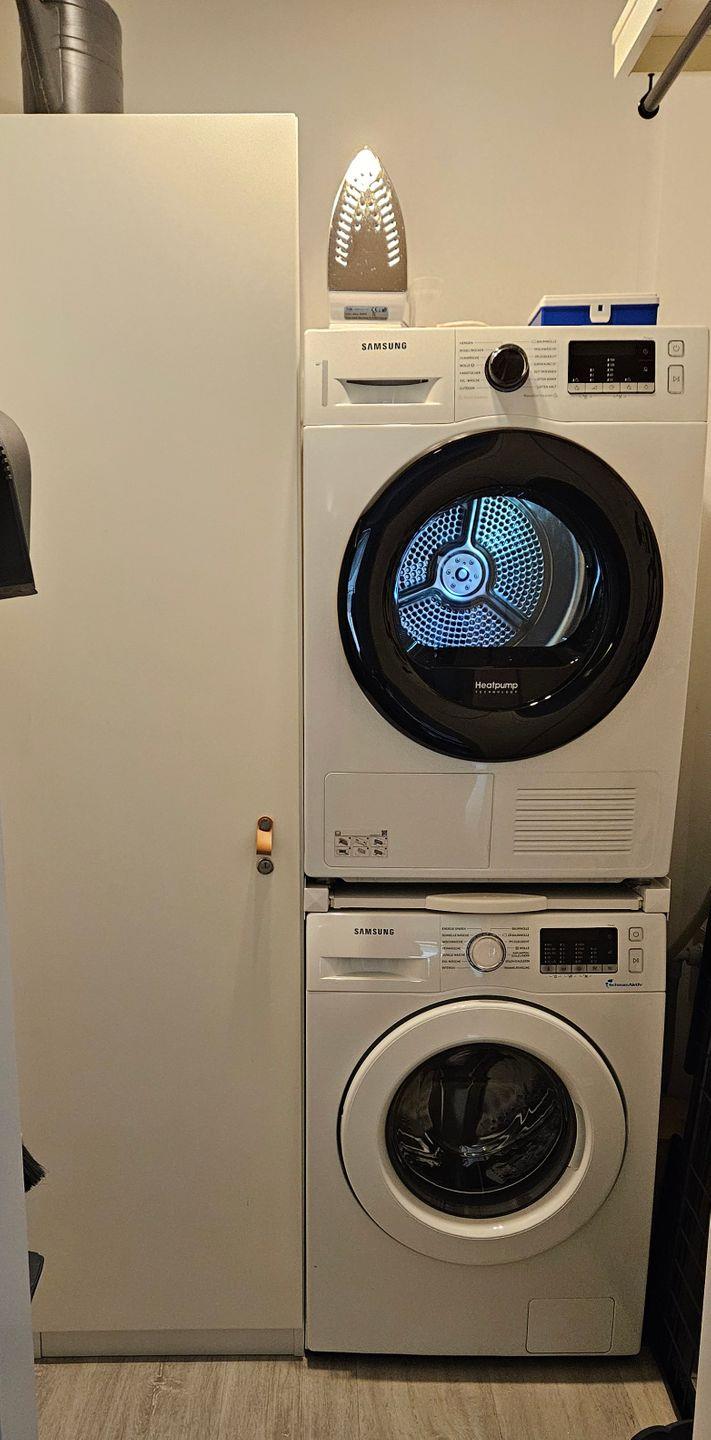 Ein Abstellraum mit Waschmaschine und Trockner, Wäscheständer und Bügeleisen komplettiert die Wohnung.