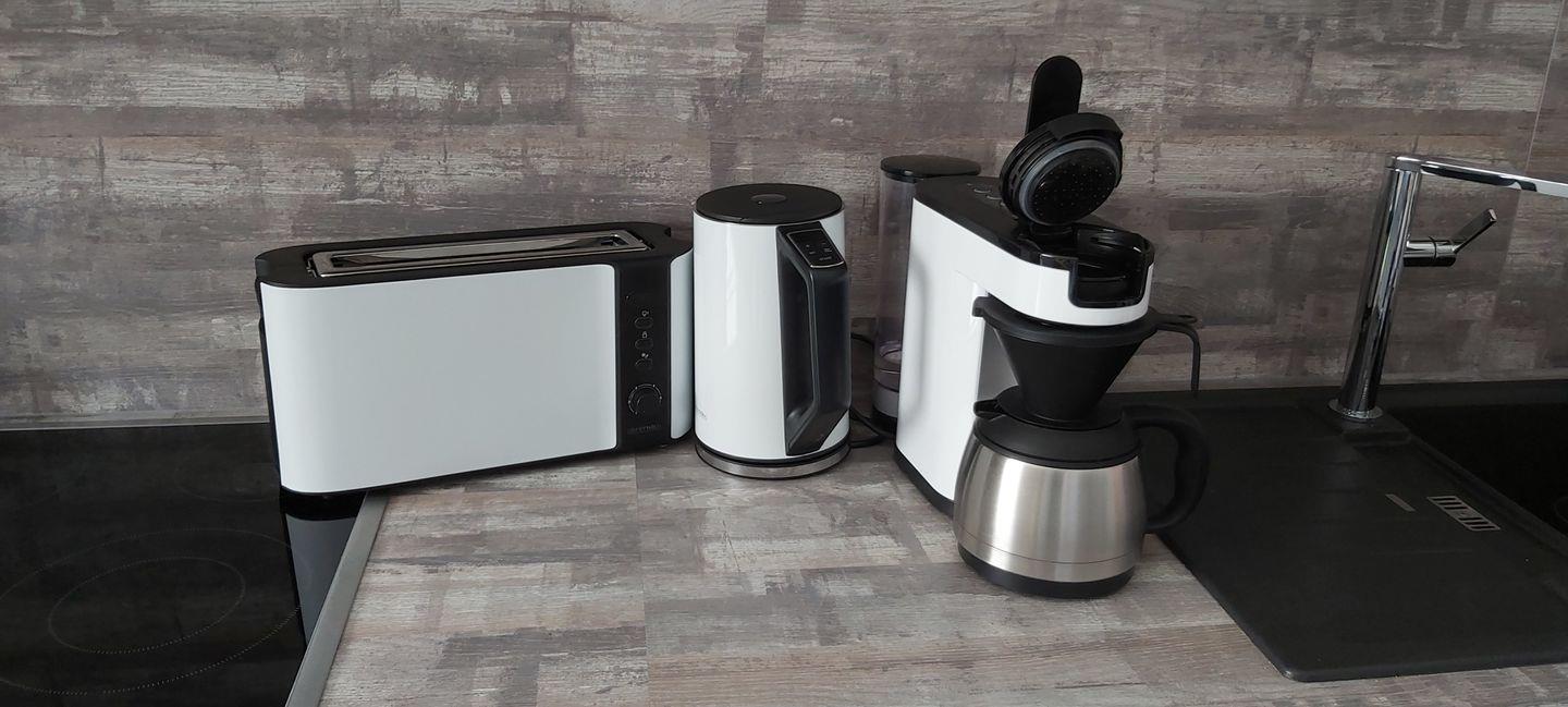Weiter geht es durch den Flur in den offenen Wohn- und Essbereich mit moderner Küchenzeile. Hier finden Sie eine Spülmaschine, einen Kühlschrank mit Gefrierfach, ein Cerankochfeld und Backofen, Wasserkocher, Toaster, Senseo-Kombi-Kaffeemaschine, Mixer und reichhaltig Geschirr, Töpfe, Gläser etc.