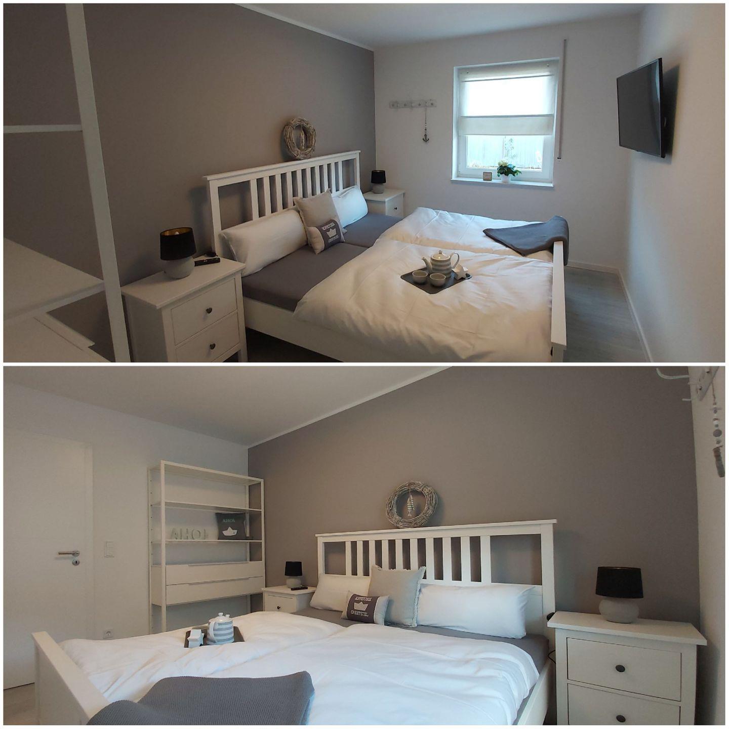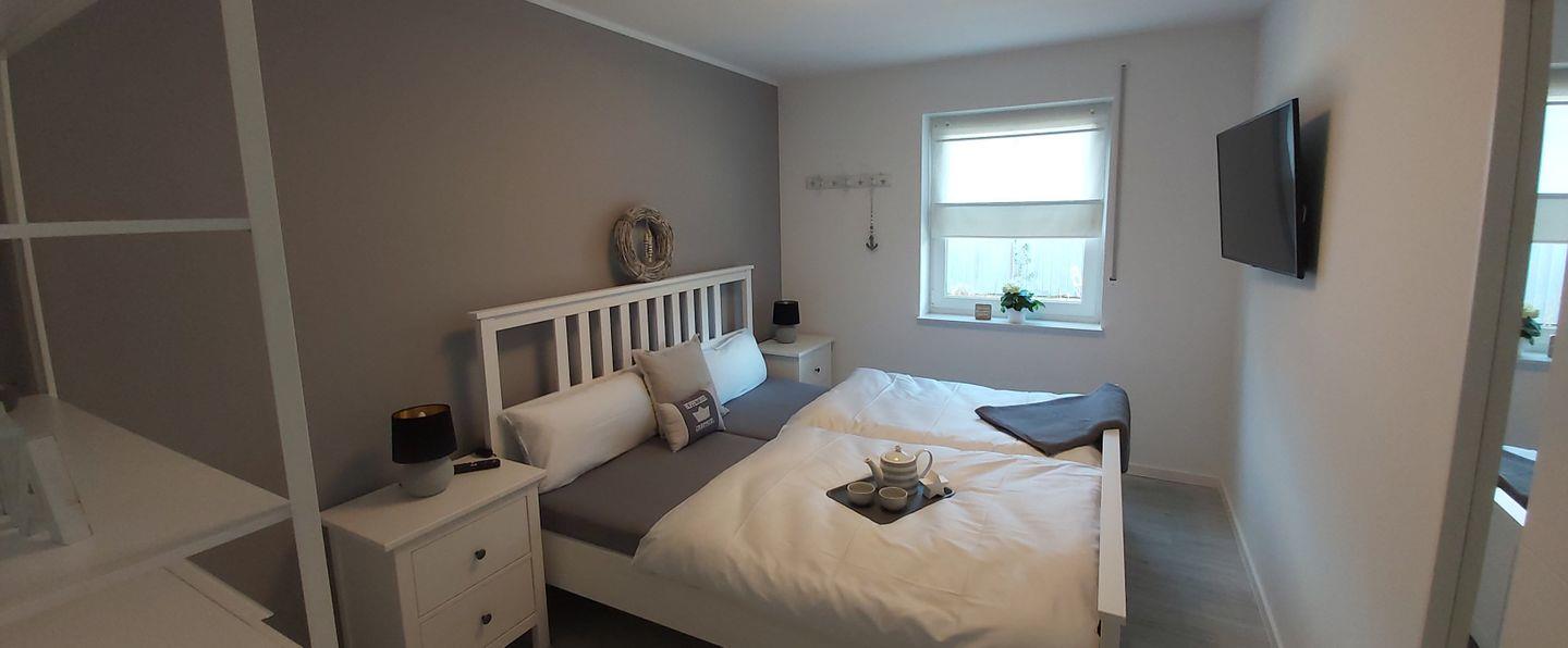 Links vom Wohnzimmer kommen Sie in das zweite Schlafzimmer mit Doppelbett, offenem Schrank und einem dritten Fernseher.