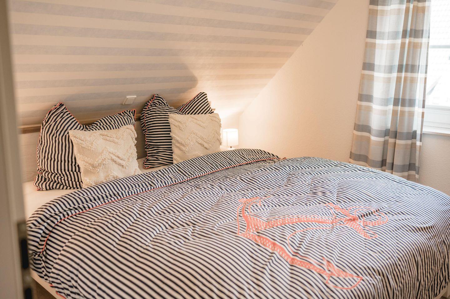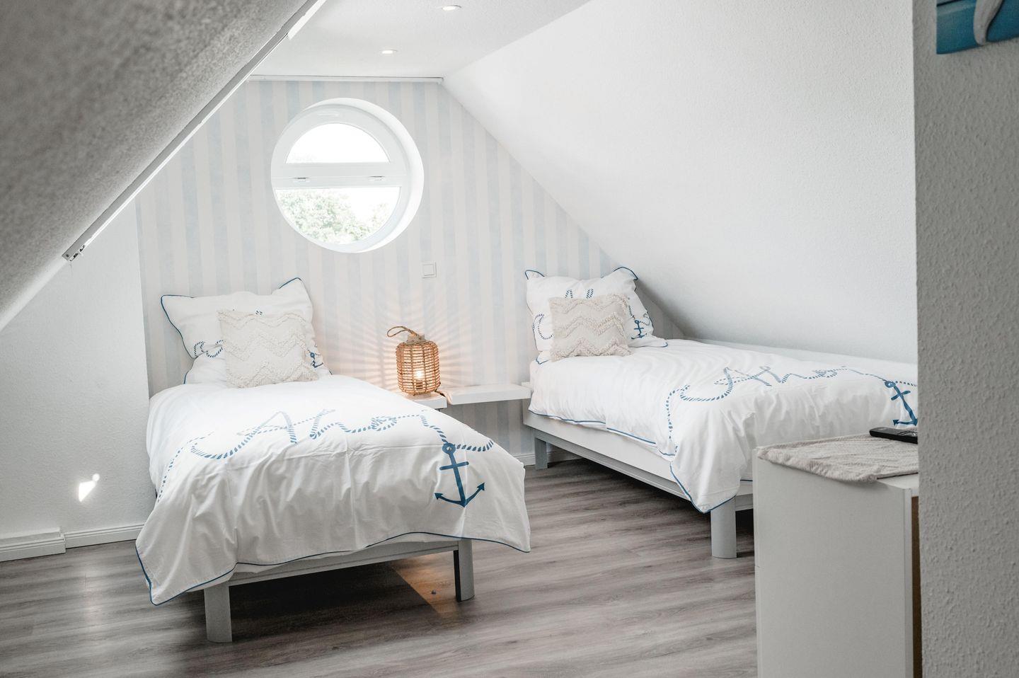 Das Schlafzimmer verfügt über ein Doppelbett (1,80 x 2,00 m), einen Kleiderschrank und einen Wand-Flachbildfernseher. In dem zweiten Schlafzimmer im Dachstudio befinden sich zwei Einzelbetten (0,90 x 2,00 m) sowie eine Kommode und ebenfalls ein Flachbildfernseher. Im Dachstudio ist ein Vorhang zur Verdunkelung des speziellen Bullaugen-Fensters angebracht. Dies verleiht dem Schlafzimmer ein gemütliches Kajütenfeeling. Eine Garderobenvorrichtung zum Aufhängen einiger Kleidungsstücke ist an der Wand angebracht.