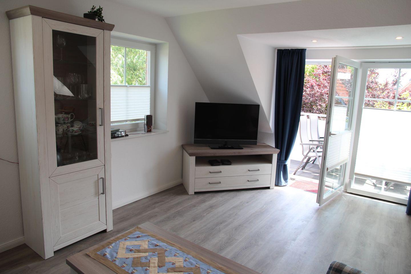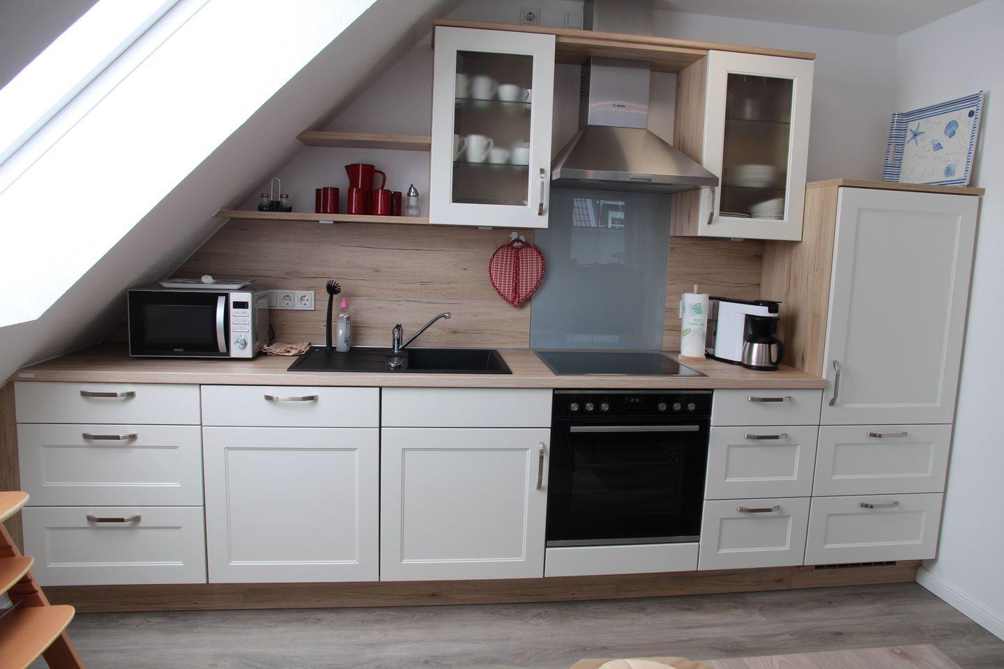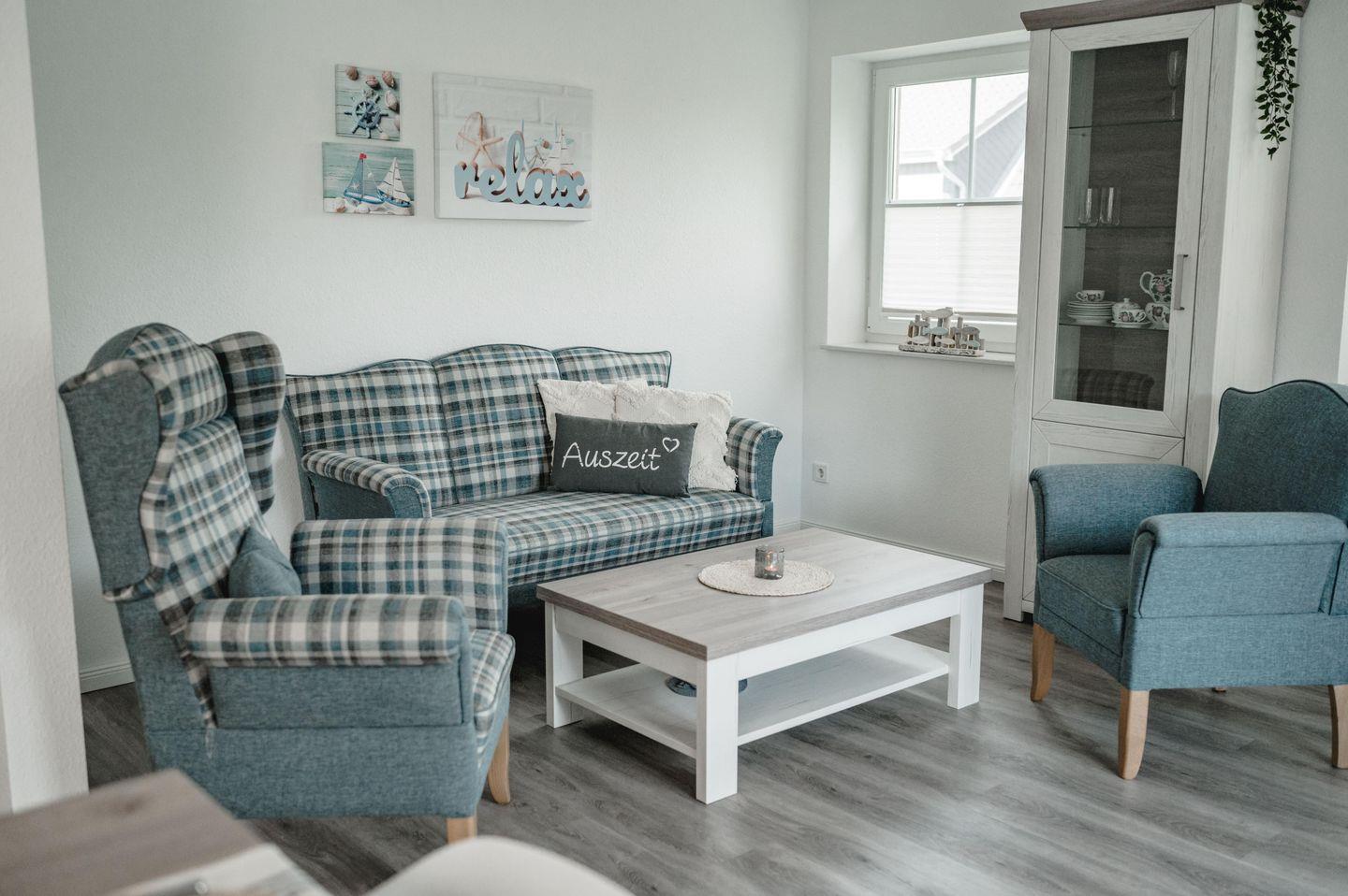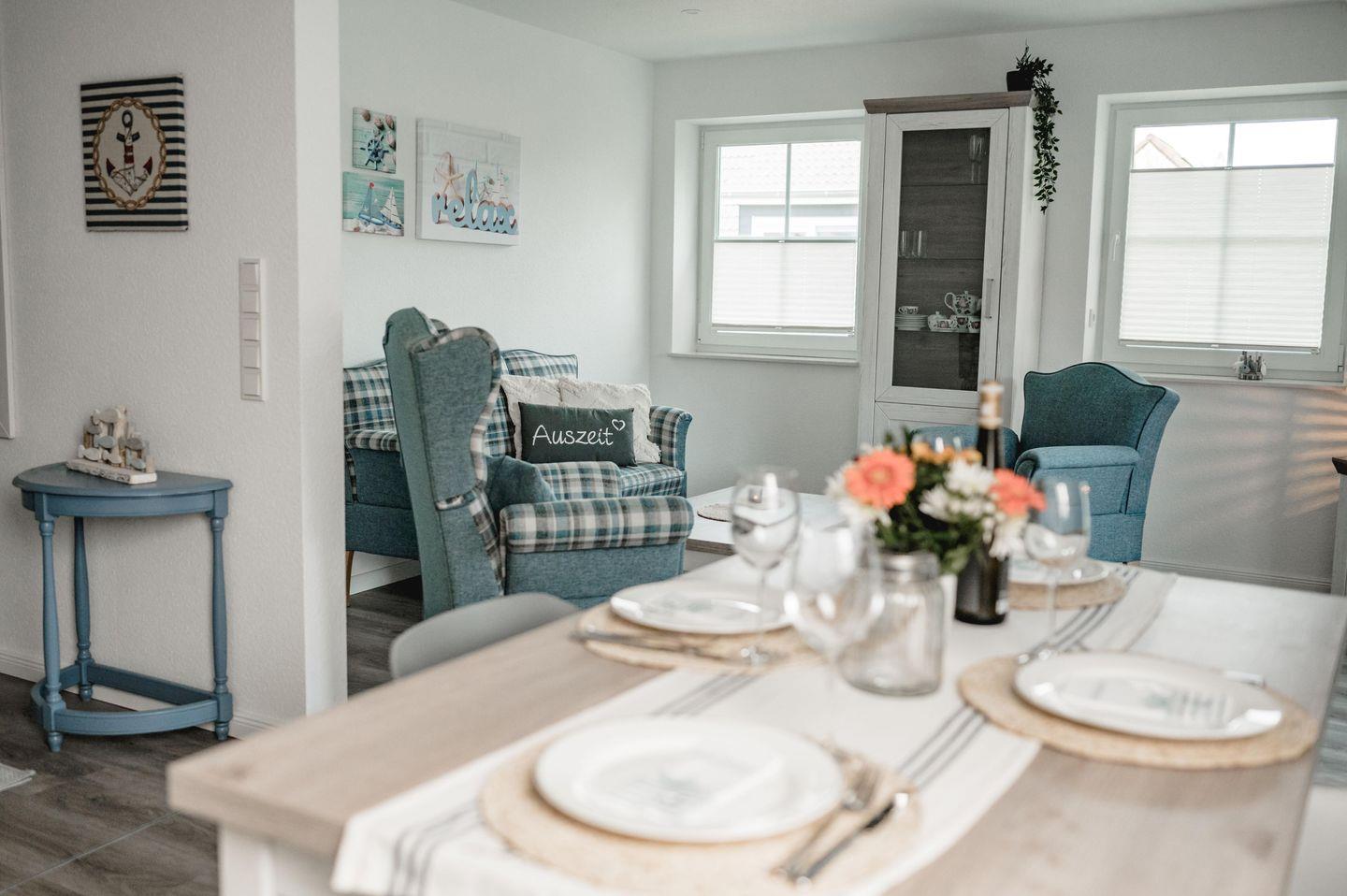 Im gemütlichen Wohnbereich finden Sie ein Friesensofa mit Sessel, Kommode, Flachbild-TV und Radio sowie einen Esstisch mit vier modernen Stühlen. Die hochwertige Küchenzeile bietet für Ihren Aufenthalt eine Kaffeemaschine, Mikrowelle, einen Toaster, Wasserkocher, Herd, Backofen, Kühlschrank (ohne Gefrierfach) und eine Geschirrspülmaschine.