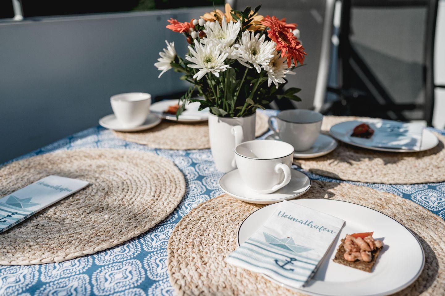 Der Balkon ist mit einem Tisch, vier Stühlen inklusive Auflagen sowie einem Sonnenschirm möbliert.