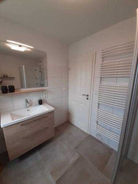 Das geräumige und helle Badezimmer überzeugt mit einer begehbaren Dusche, einem Handtuchtrockner und einem Föhn sowie zahlreichen, praktischen Ablagemöglichkeiten für Ihre Badutensilien.