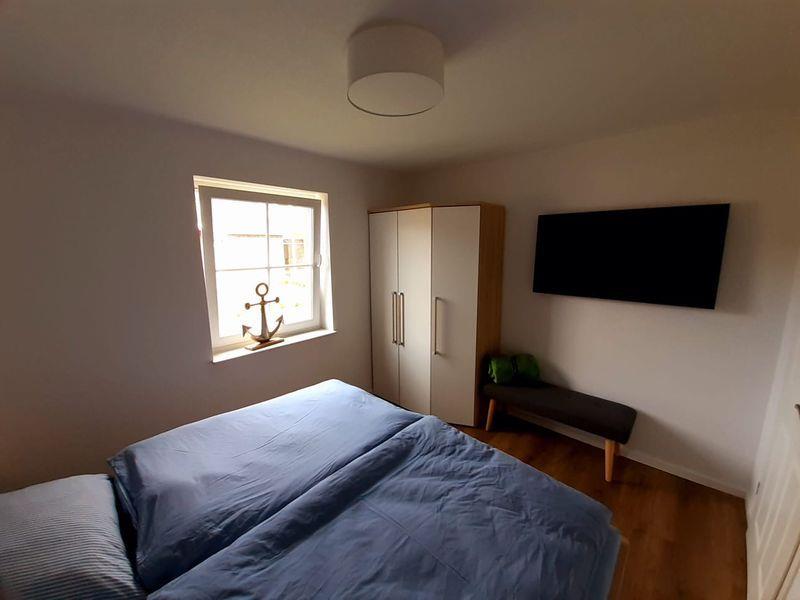 Die Ferienwohnung verfügt über zwei Schlafzimmer, die beide mit einem Doppelbett (1,80 x 2,00 m), einem vollwertigen Kleiderschrank, zusätzlichen Ablagemöglichkeiten und einem Fernseher (Smart-TV) ausgestattet sind. Beide Schlafräume lassen sich ebenfalls durch elektrische Außenjalousien abdunkeln.
