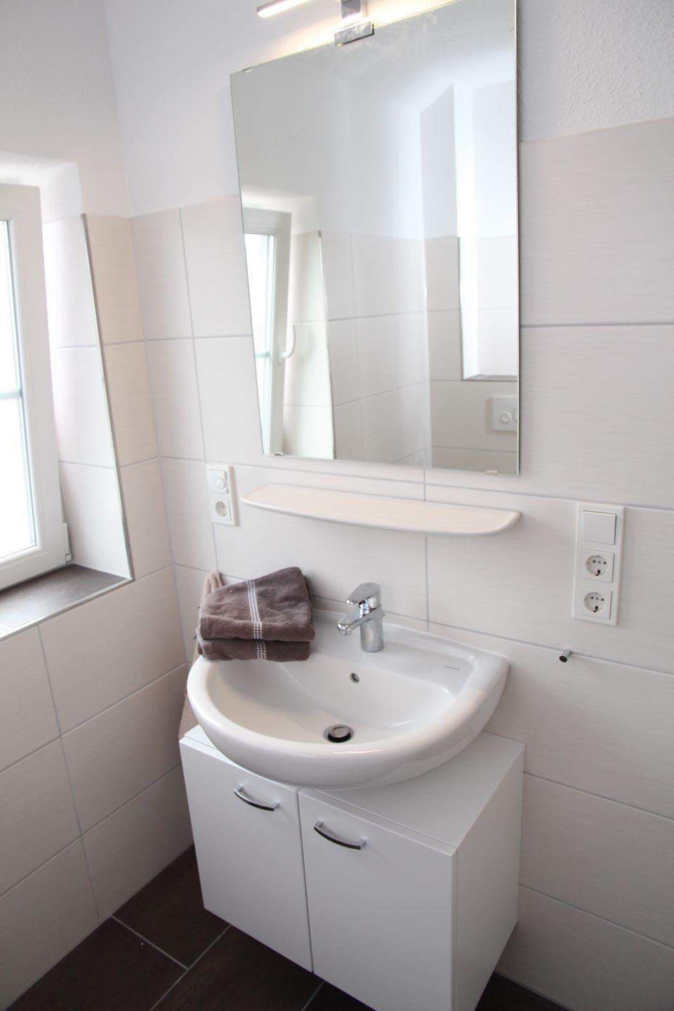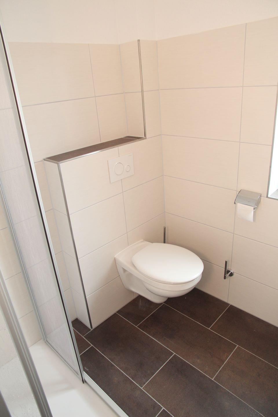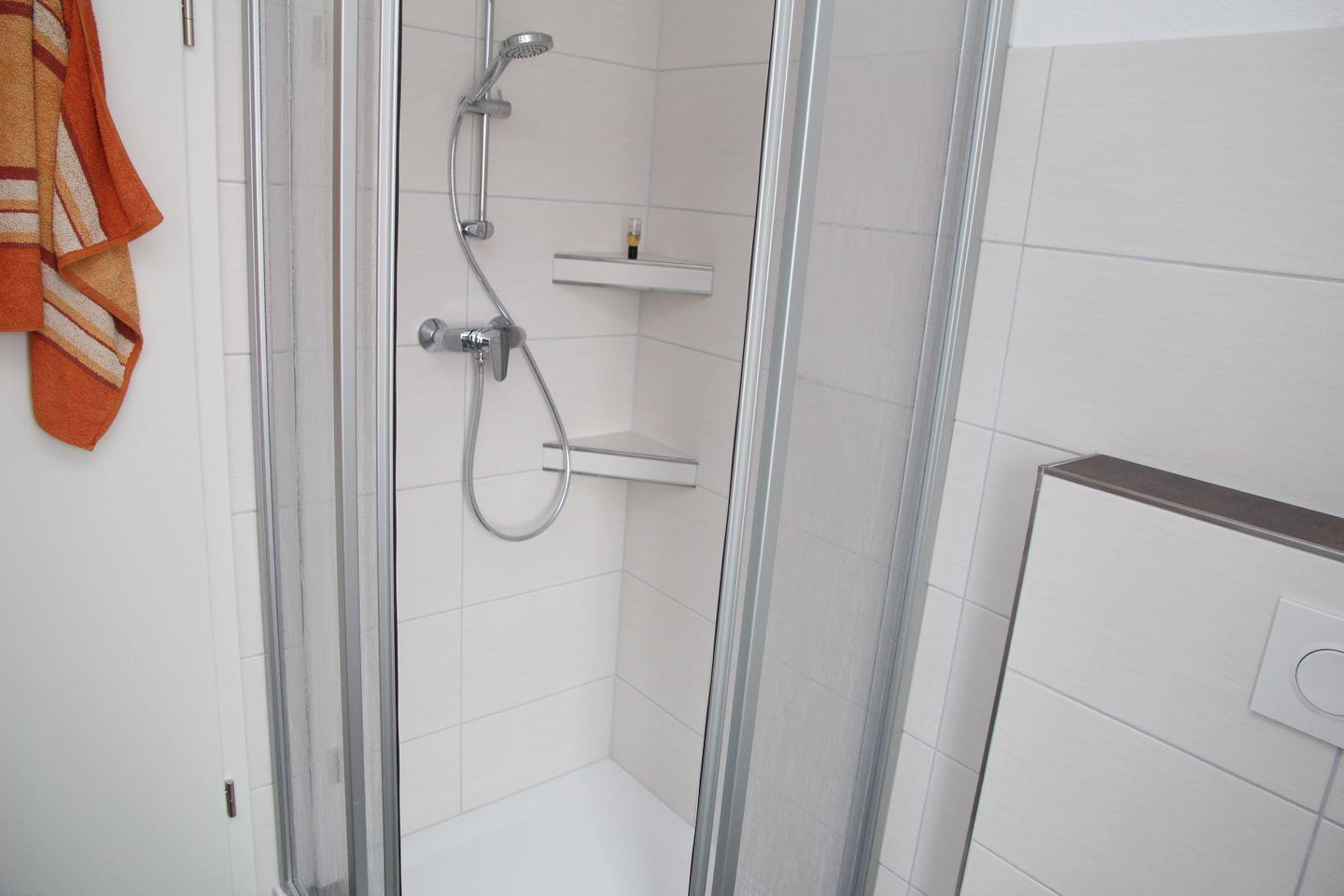 Das moderne Badezimmer verfügt über eine ebenerdige Eckdusche, einen Föhn und ausreichend Abstellmöglichkeiten. Zusätzlich verfügt die Wohnung über ein separates Gäste-WC.