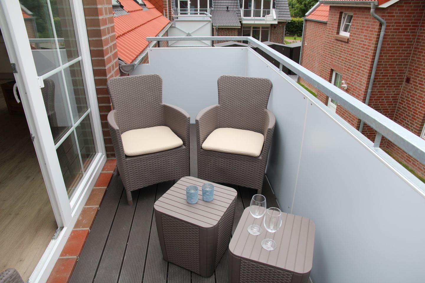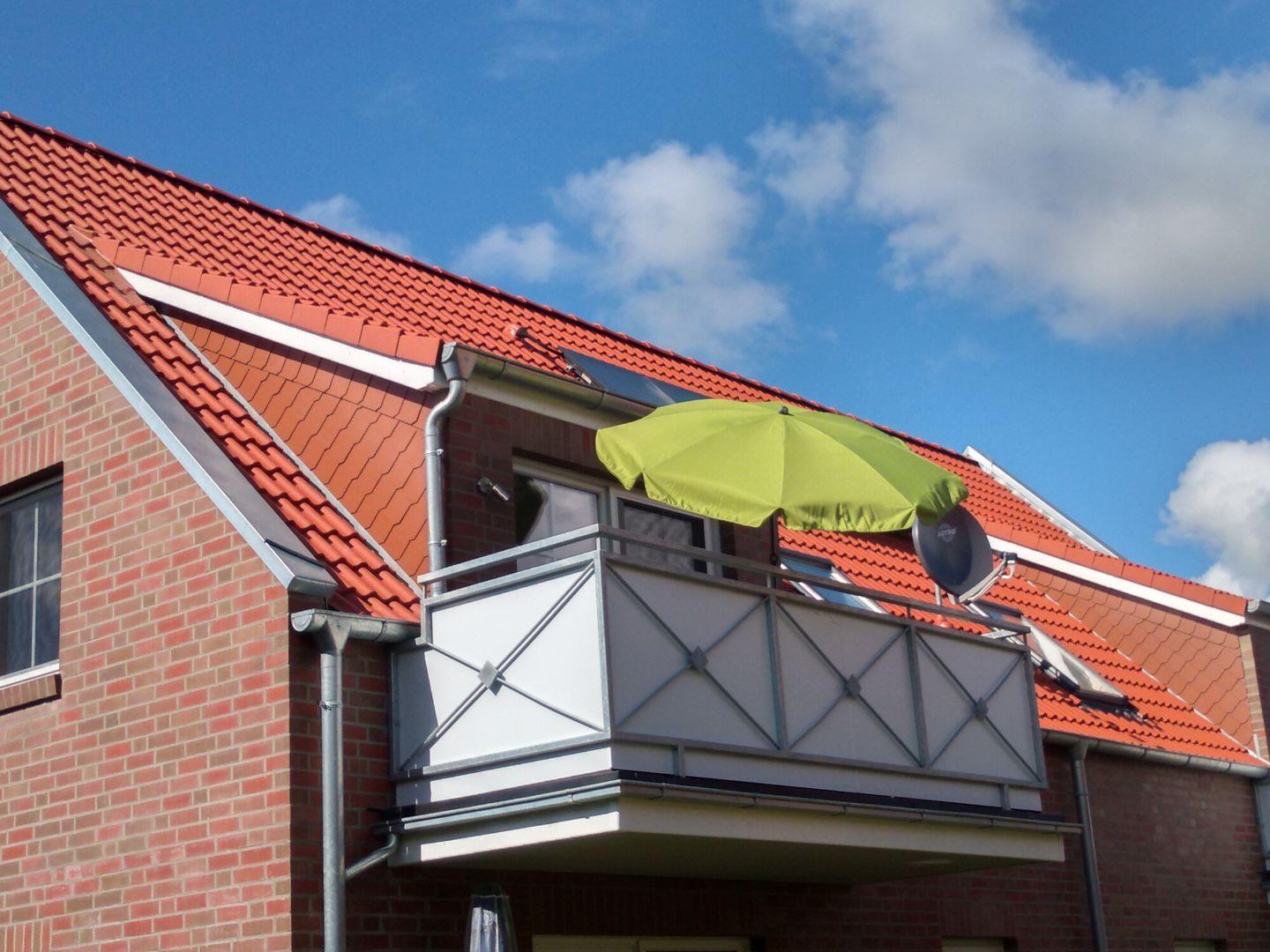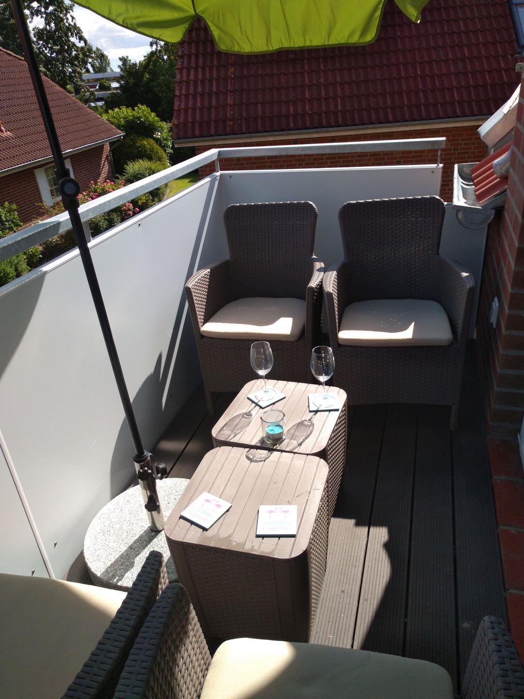 Der große Balkon ist möbliert mit 4 bequemen Gartenstühlen, zwei kleinen Tischen und einem Sonnenschirm.