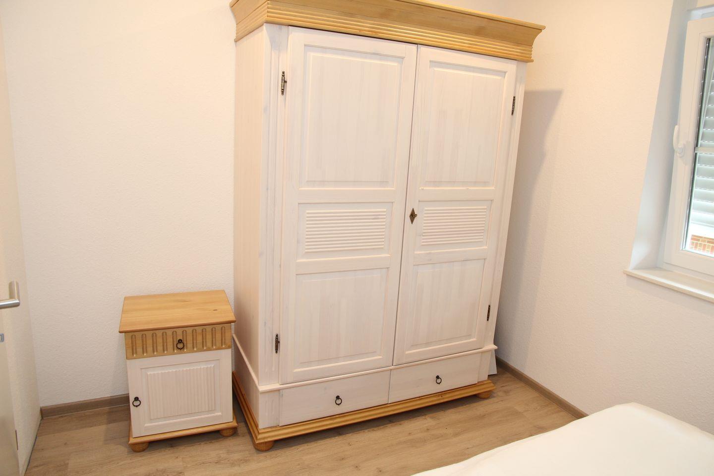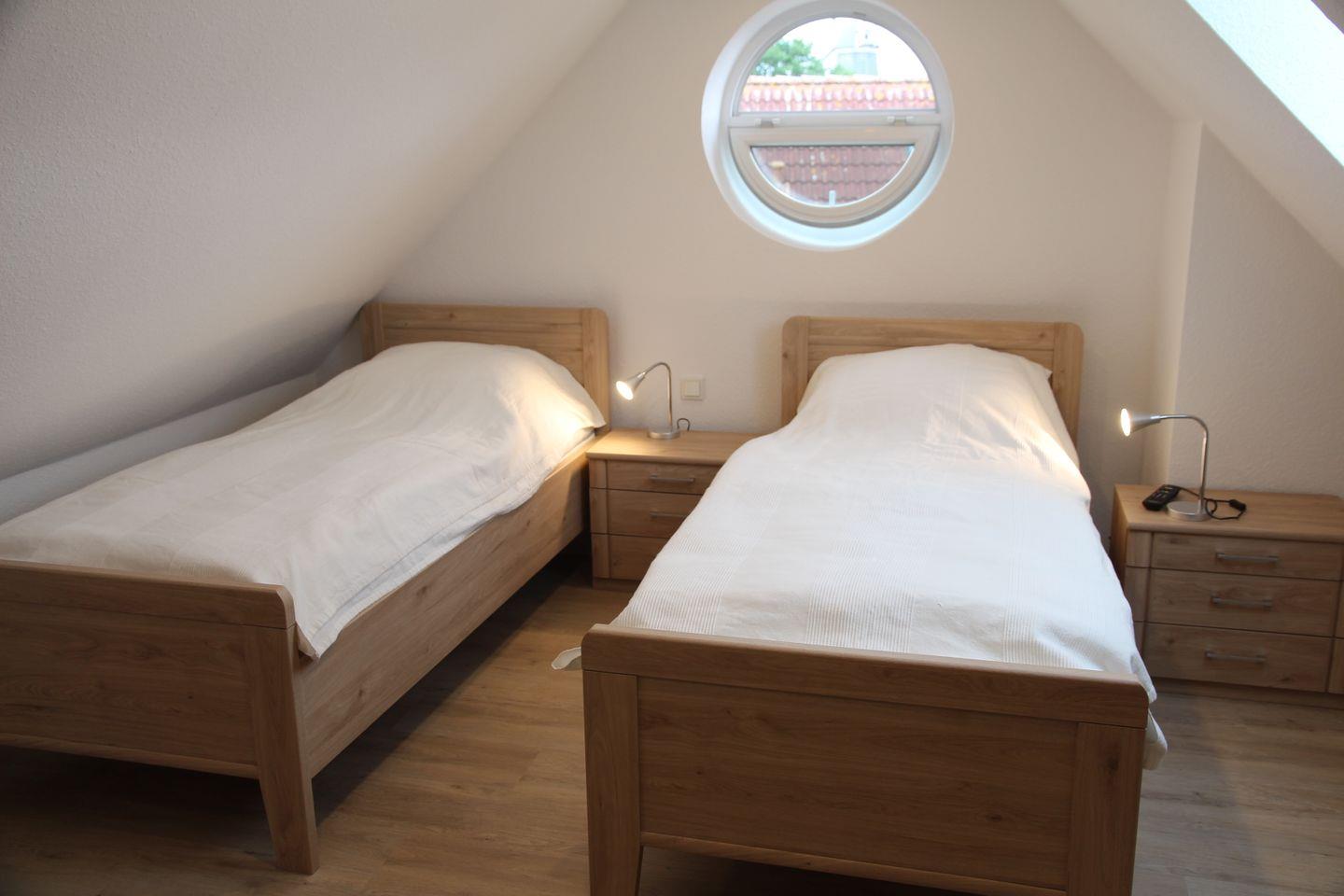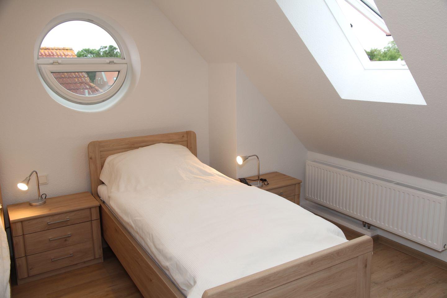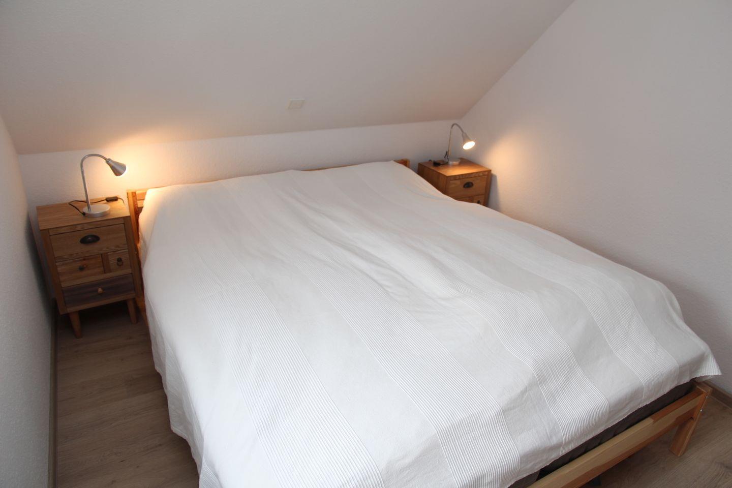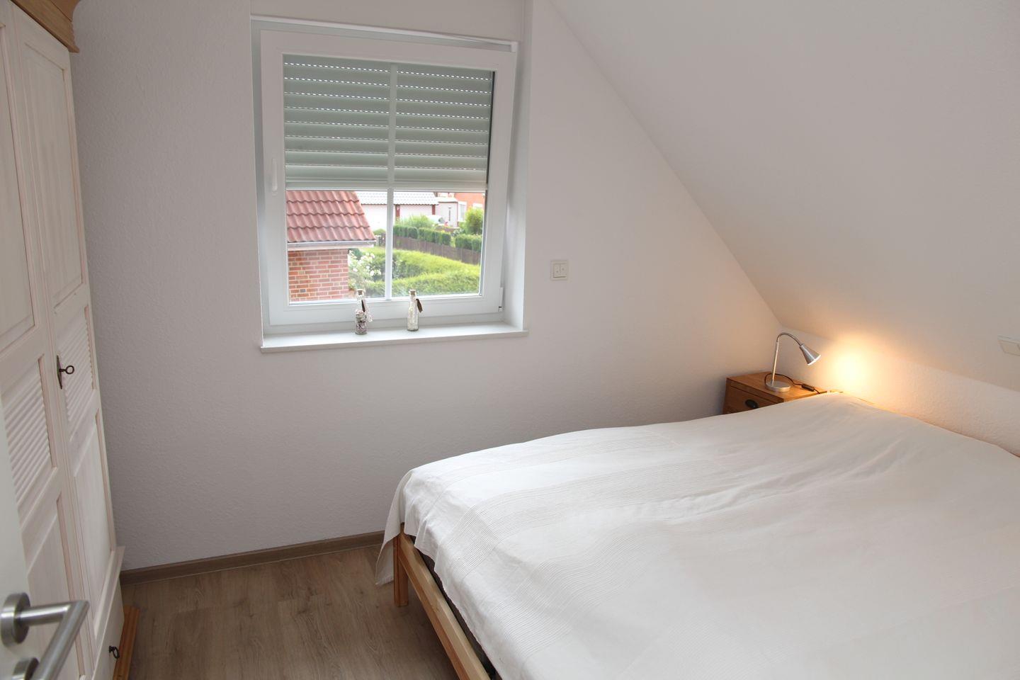 Hier finden Sie alles, was Ihr Urlauberherz begehrt. Die Wohnung verfügt über zwei Schlafzimmer, wovon sich ein Schlafzimmer mit zwei Einzelbetten im ausgebauten Dachboden befindet. Ein Smart-TV ist dort vorhanden. Die Fenster sind abdunkelbar. Das zweite Schlafzimmer mit einem Doppelbett und einem Kleiderschrank befindet sich im 1. OG, elektrische Außenjalousien sind hier vorhanden. Fliegengitter sind vorhanden.