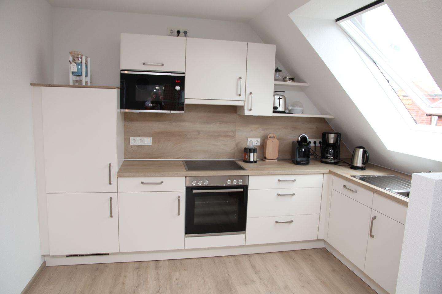 Die moderne und geschmackvoll eingerichtete Einbauküche ist komplett ausgestattet mit einer Geschirrspülmaschine, Backofen, Ceranfeld, Kühlschrank mit Gefrierfach, Senseomaschine (von Bosch), Wasserkocher, Kaffeemaschine u.v.m.