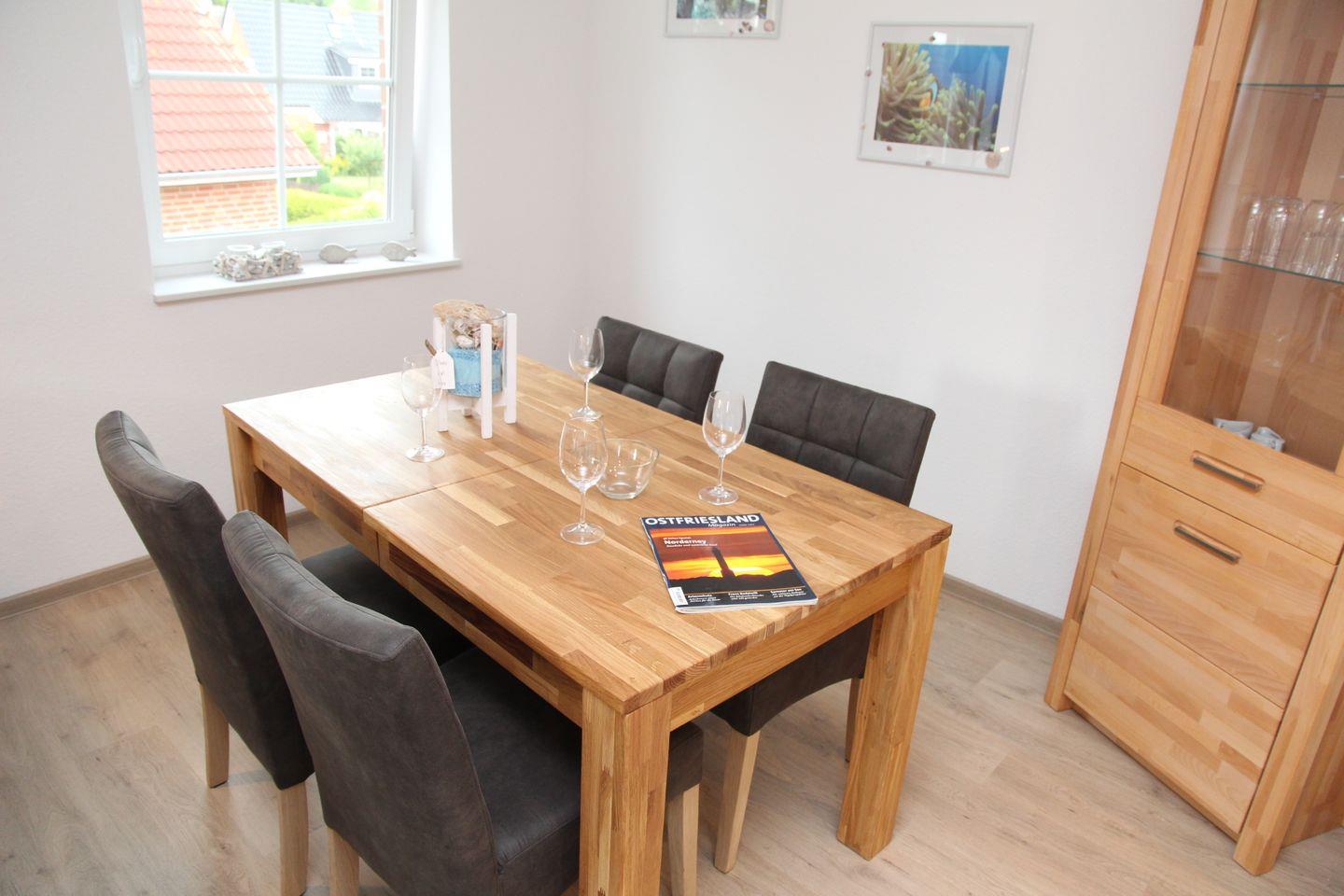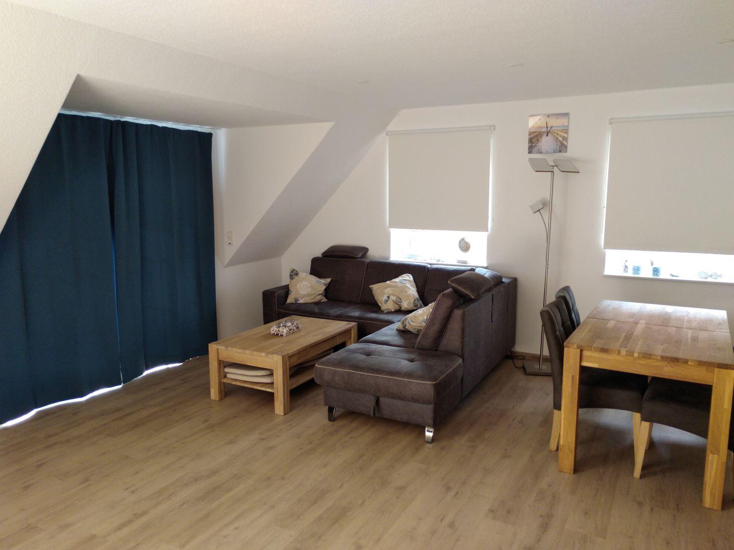 Der Wohn-Essbereich lädt ein zu gemütlichen Stunden auf der bequemen Eck-Garnitur vor dem Fernseher (Smart TV) oder aber an den großen Esszimmertisch zu leckeren Mahlzeiten. Seit Mai 2022 gibt es im Wohnbereich nun auch Gardinen und Rollos zum Sonnenschutz.
