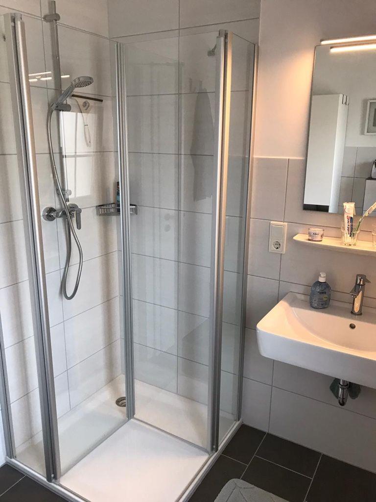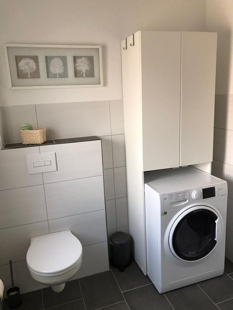 Im modernen Duschbad finden Sie einen Föhn sowie einen Waschtrockner.