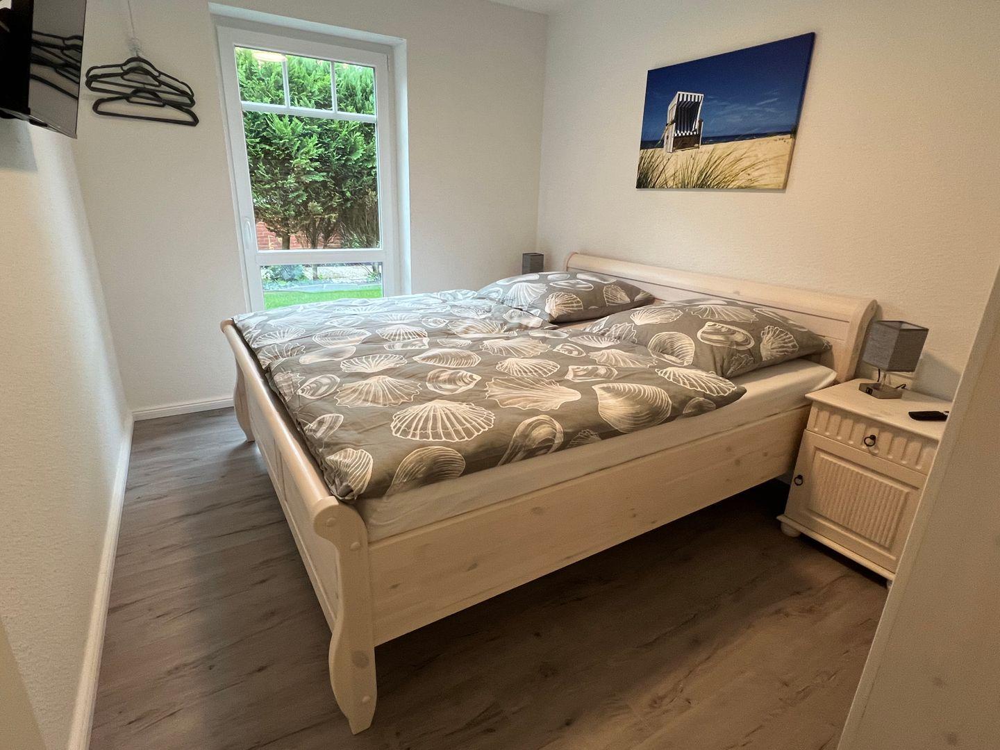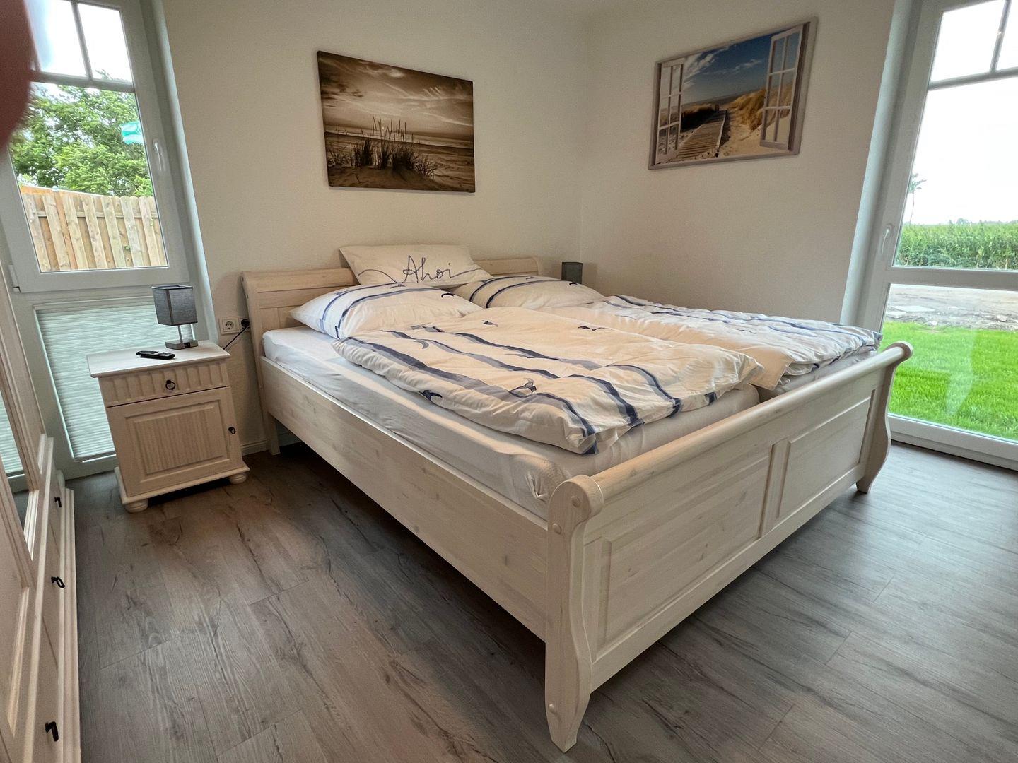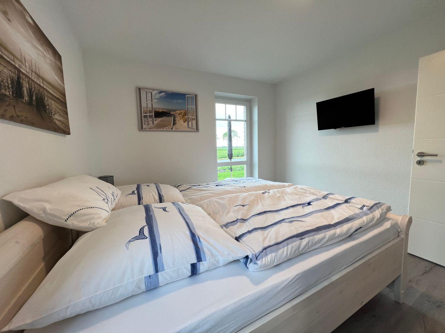 Die beiden Schlafzimmer verfügen jeweils über ein Doppelbett und einen Flachbildfernseher, das eine Schlafzimmer hat einen Kleiderschrank, das andere Schlafzimmer hat eine Kommode und zusätzliche Kleiderhaken. Am Bett finden Sie jeweils mehrere USB-Anschlüsse zum Aufladen Ihrer mobilen Geräte.