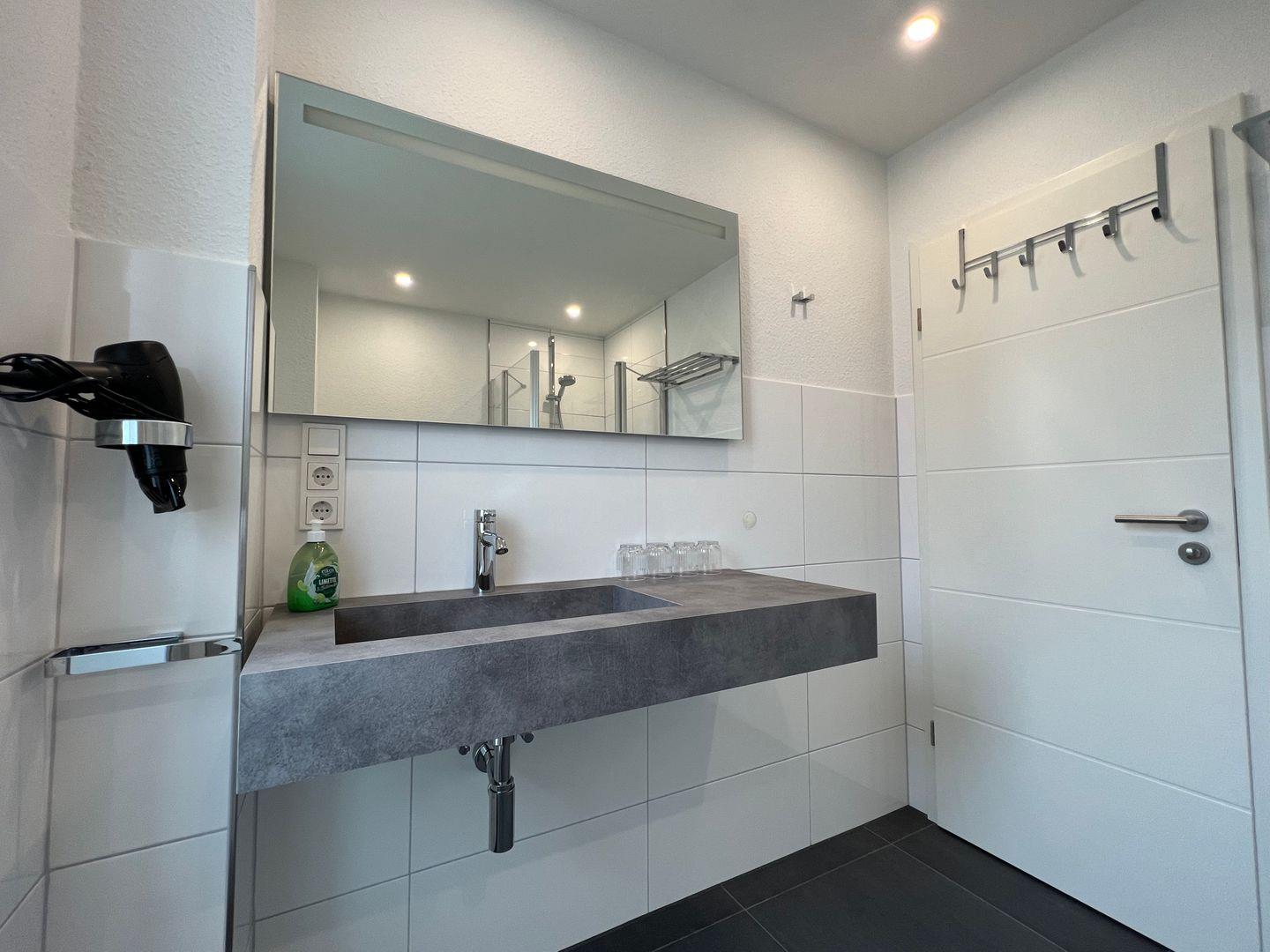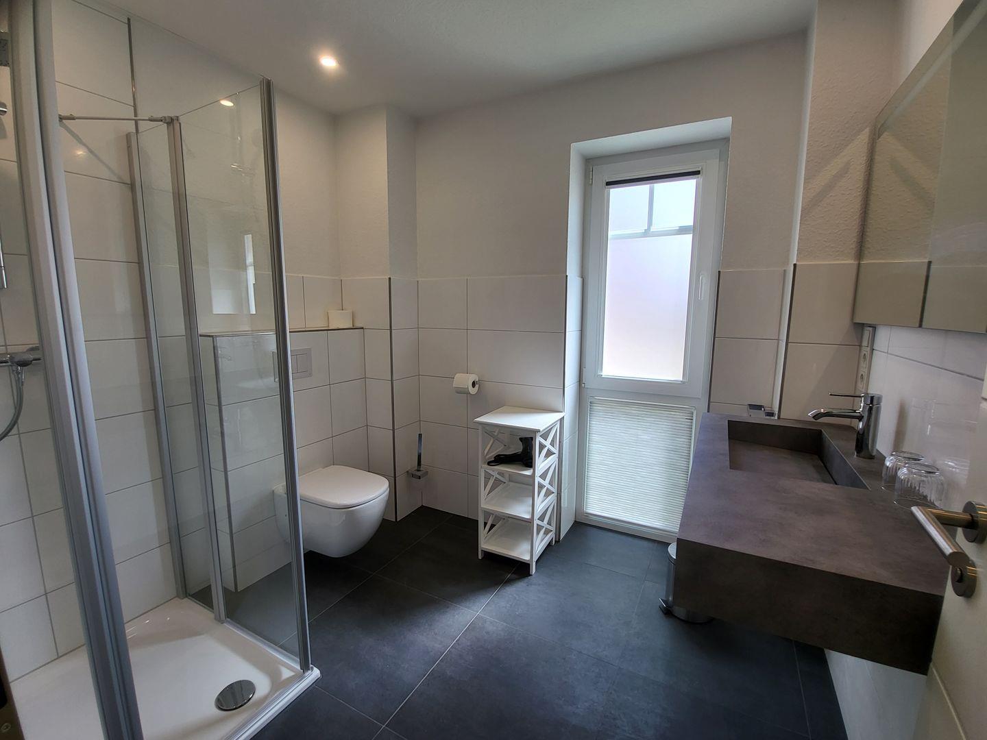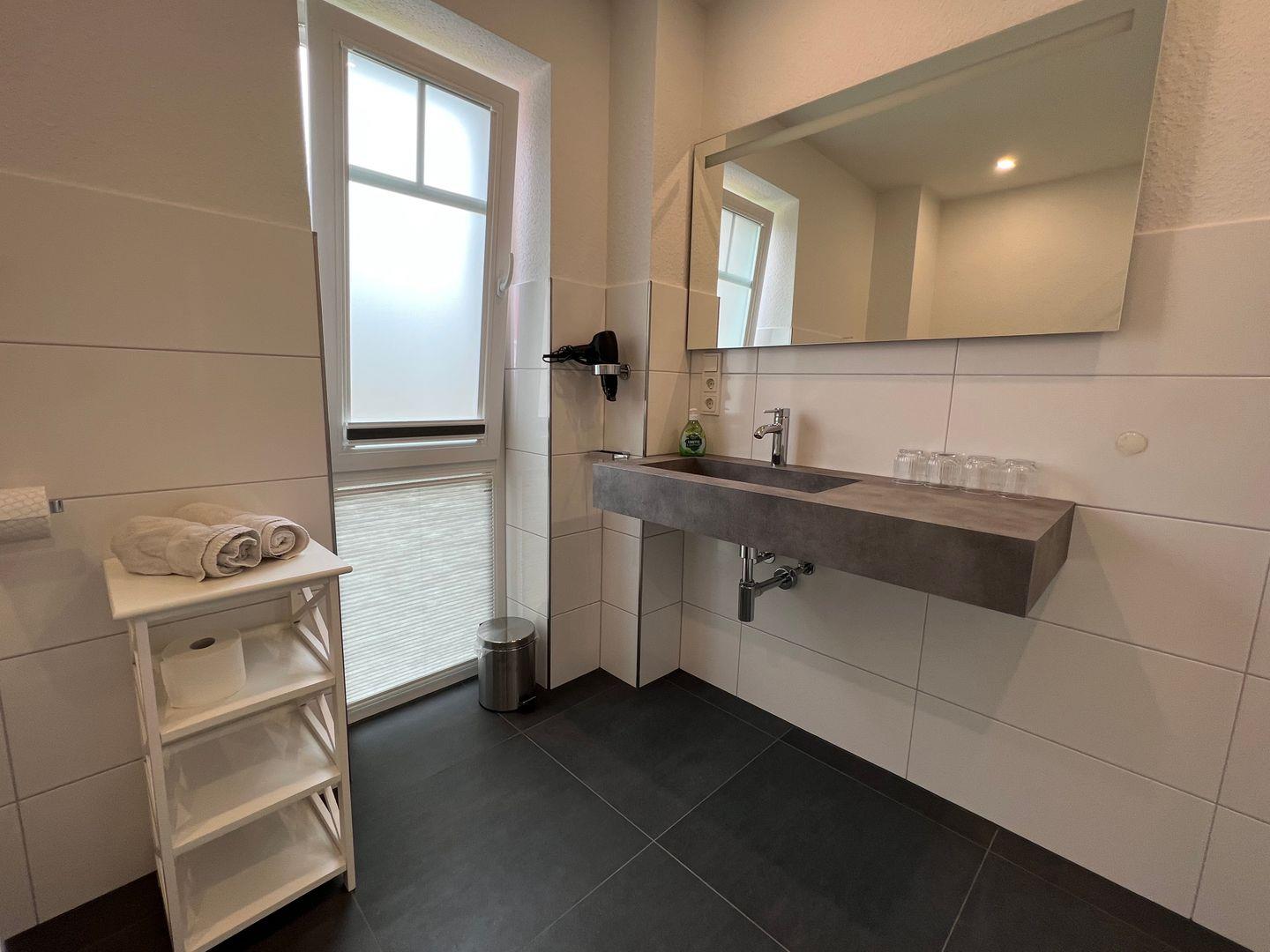 Das helle Duschbad bietet einen großen Waschtisch, eine Dusche mit flachem Einstieg und einen Föhn. Im Abstellraum ist eine Waschmaschine und ein Trockner vorhanden.