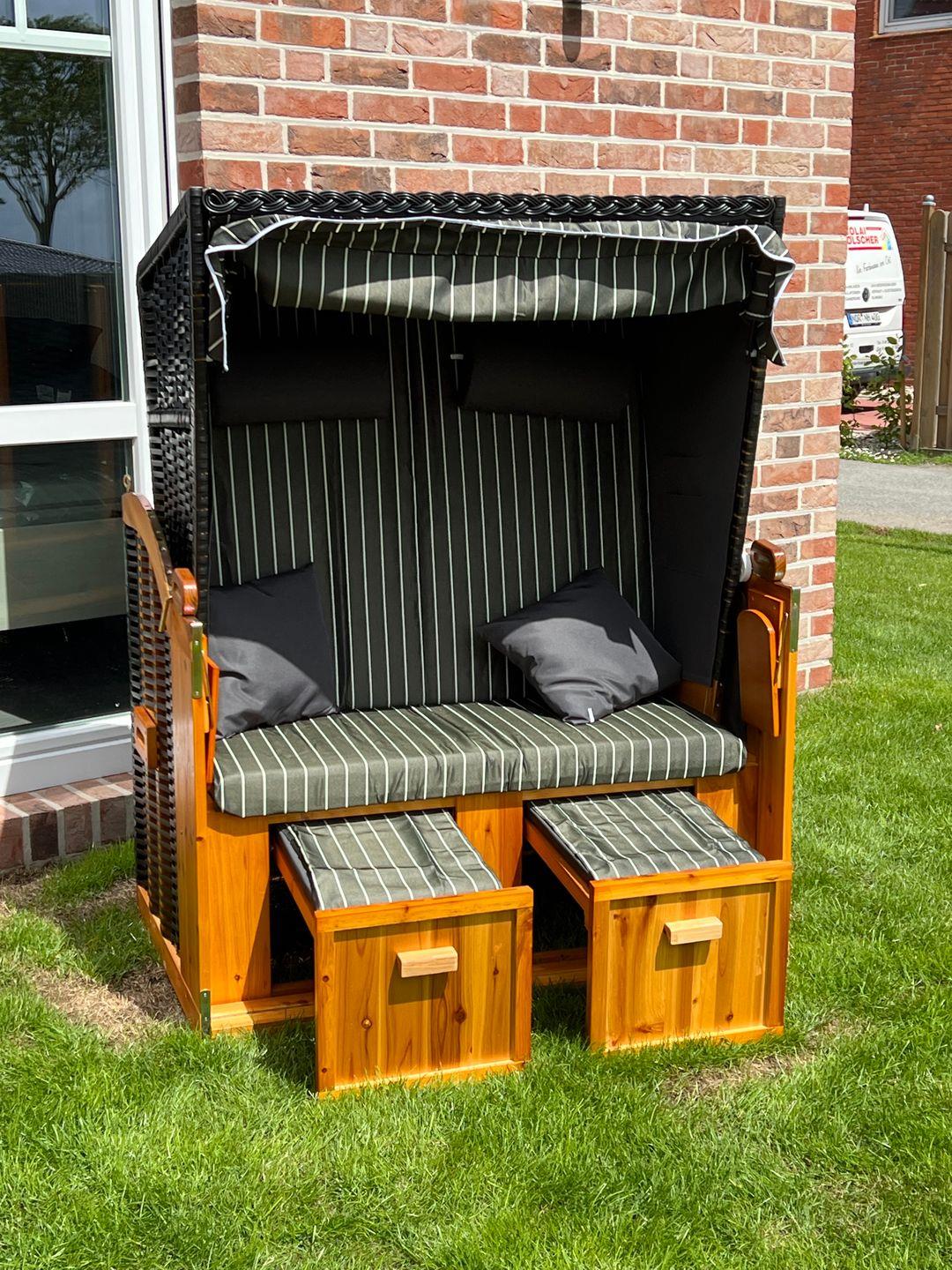 Vom Wohnbereich aus kommen Sie in den Garten mit zwei großzügigen Terrassen mit jeweils einem Tisch, vier verstellbaren Stühlen, zwei weiteren Stühlen und einem Sonnenschirm. Im Abstellhaus finden Sie auch noch zwei Sonnenliegen vor.