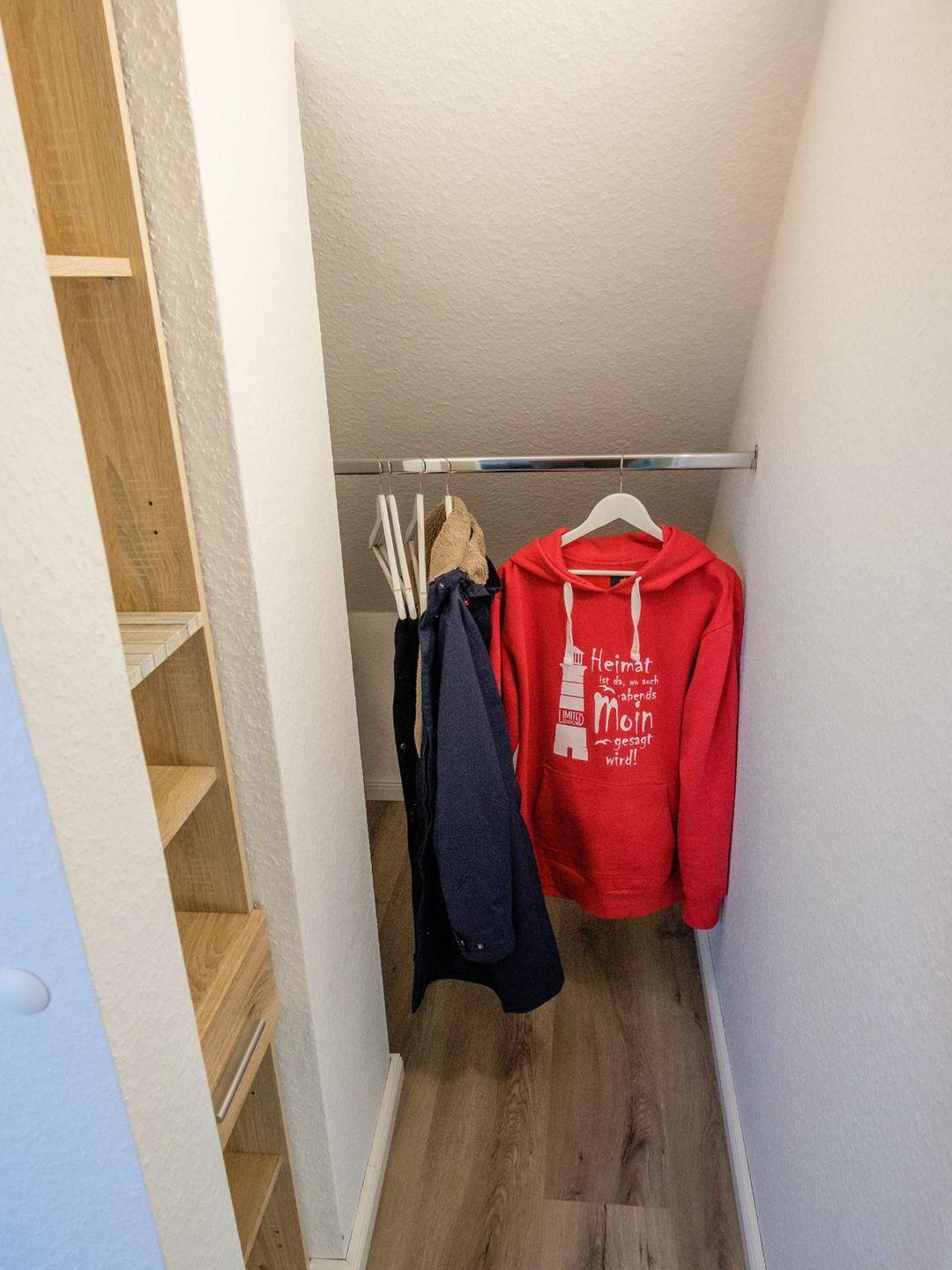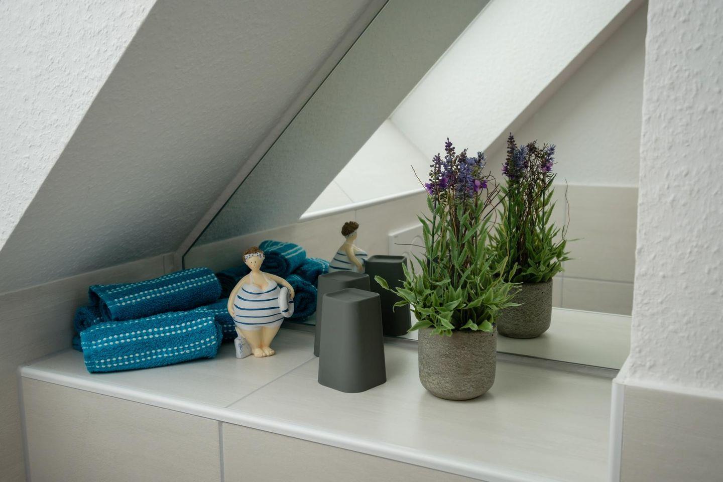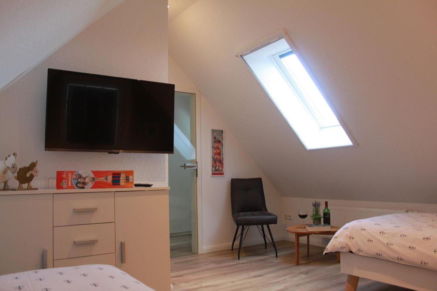 Über eine Treppe erreichen Sie den sonnigen Spitzboden mit dem zweiten Schlafzimmer und einer zusätzlichen Toilette. Das Schlafzimmer ist mit zwei Einzelbetten ausgestattet, die bei Bedarf zusammen geschoben werden können. Ein begehbarer Kleiderschrank und eine Kommode bieten viele Abstellmöglichkeiten. Ein Flachbildfernseher ermöglicht spannende Unterhaltung. Auch dieser Fernseher ist ans Internet angeschlossen. Ein gemütlicher Sessel bietet sich für Leseabende an. Wenn Sie Ihre Ruhe haben möchten, schließen Sie einfach die Tür zum Obergeschoß.