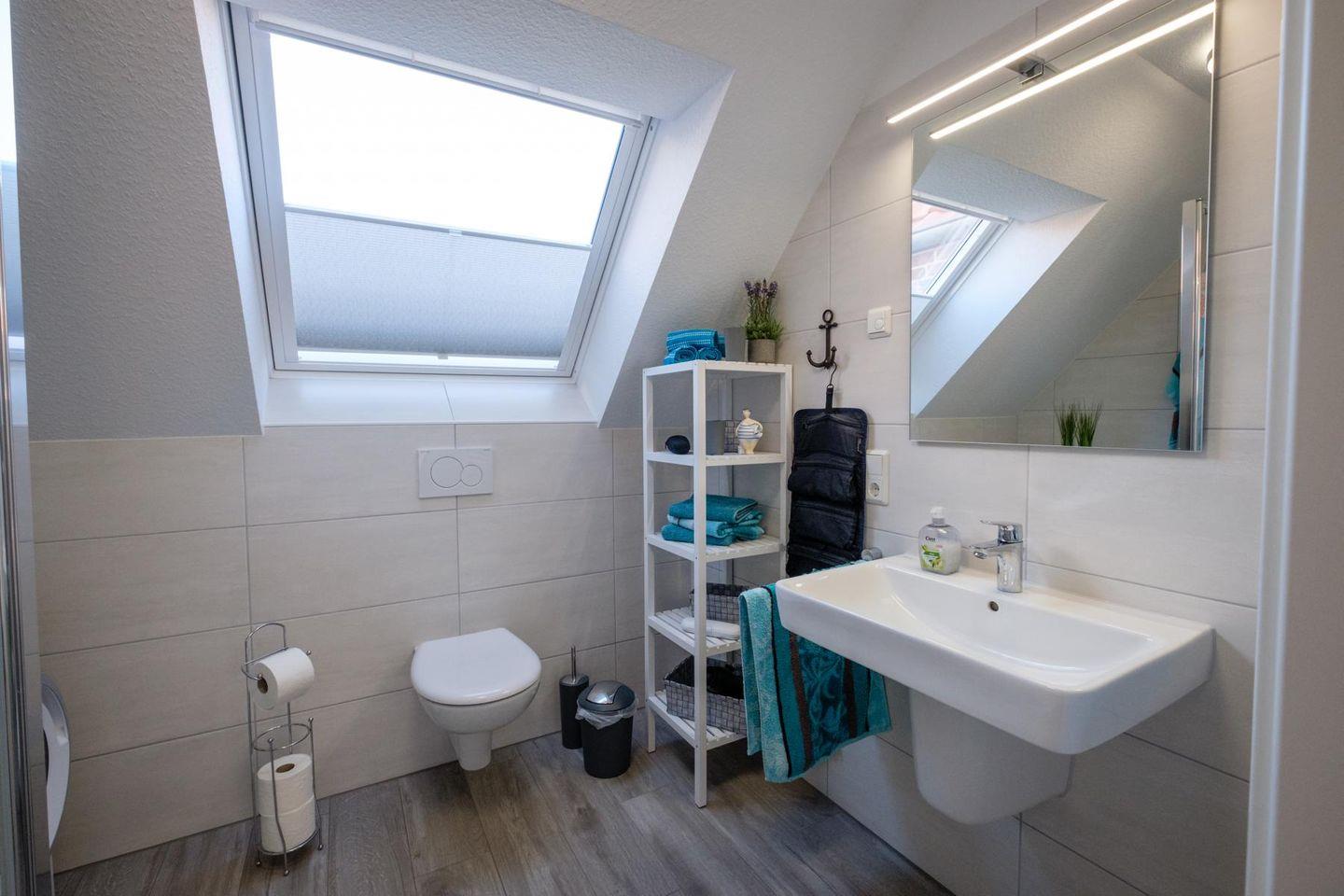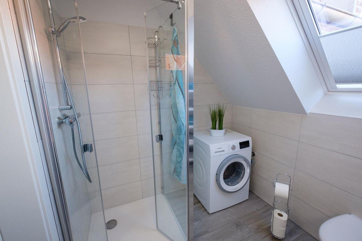 Das helle, geräumige Badezimmer ist mit einer bodentiefen Dusche, einem elektrischen Handtuchheizkörper, vielen Ablagemöglichkeiten und einer Waschmaschine ausgestattet.