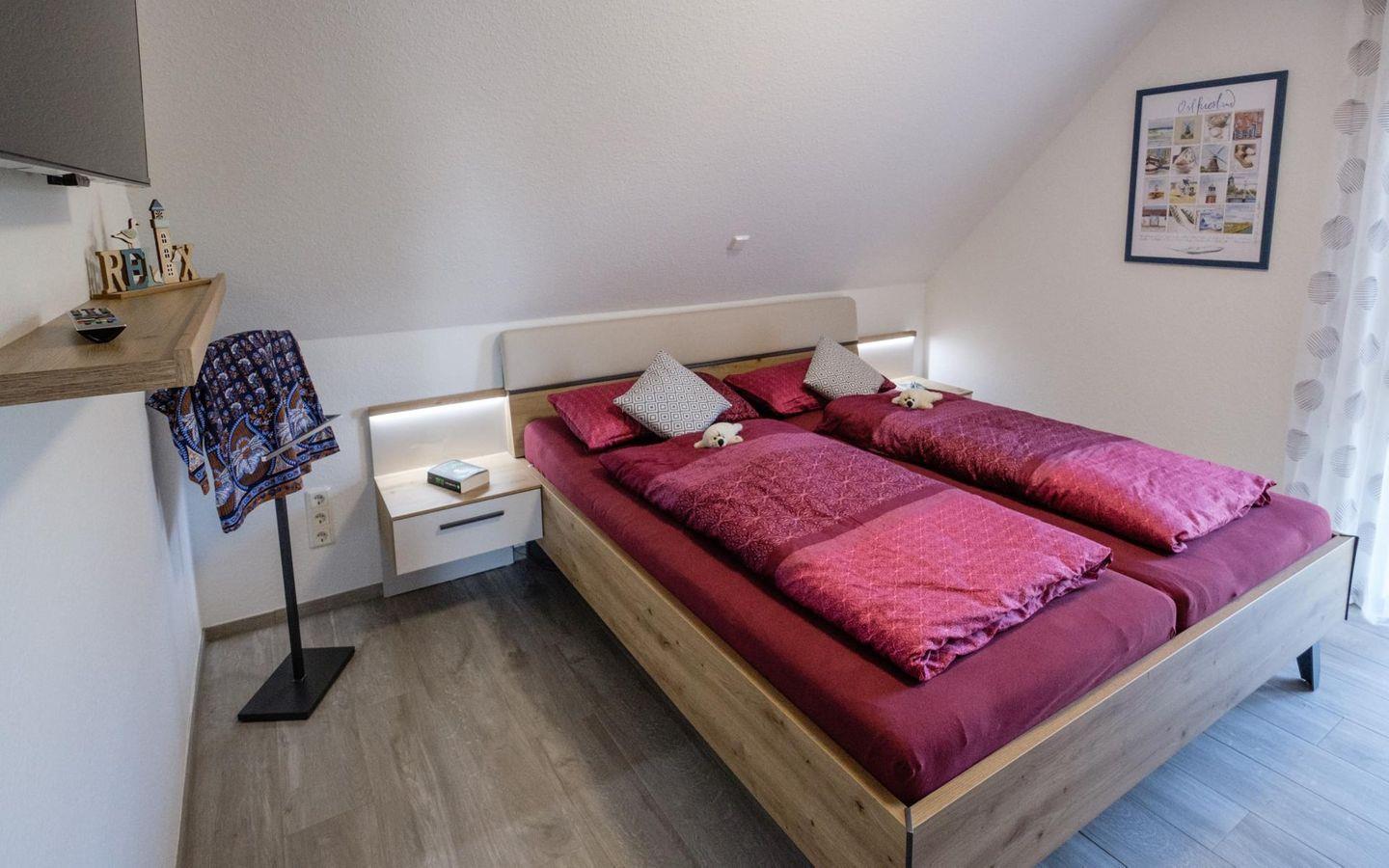 Das Schlafzimmer im Obergeschoß ist mit einem großen Doppelbett, viel Stauraum, Ablagemöglichkeiten und einem (internetfähigen) Flachbildfernseher ausgestattet um Sie entspannt schlafen zu lassen, und Ihnen die Möglichkeit zum Rückzug zu bieten.
