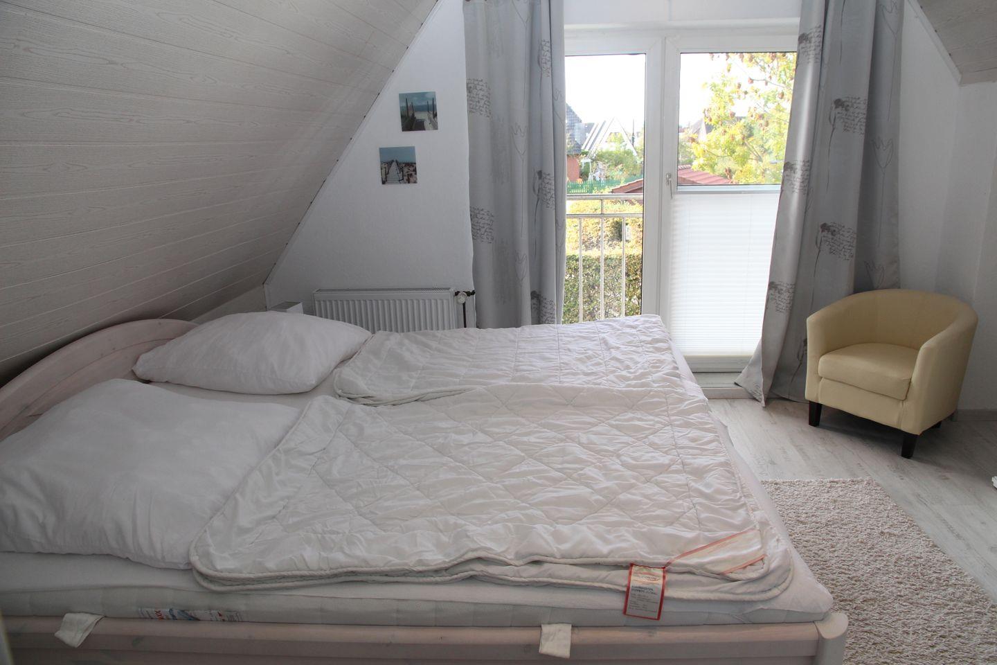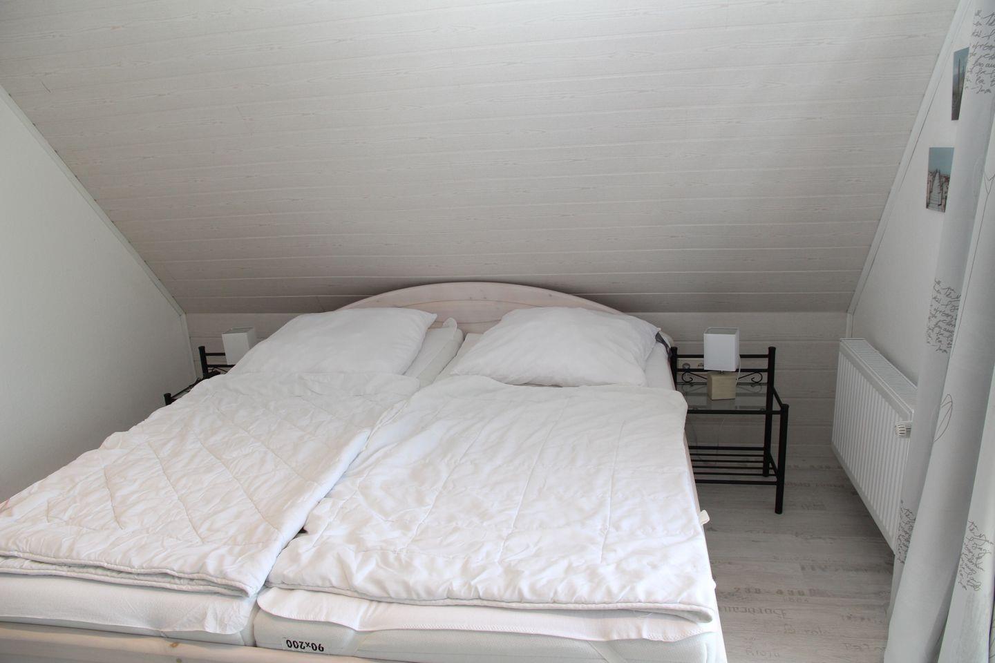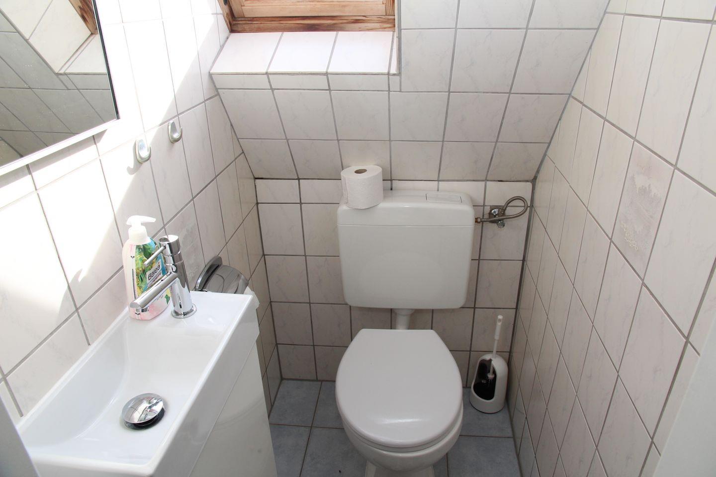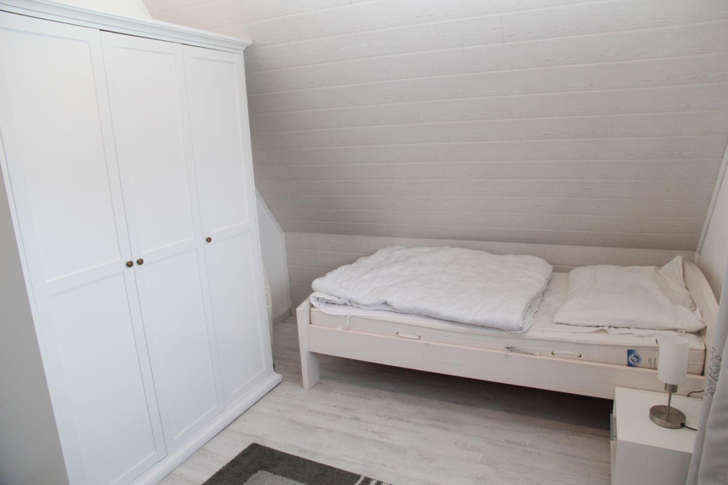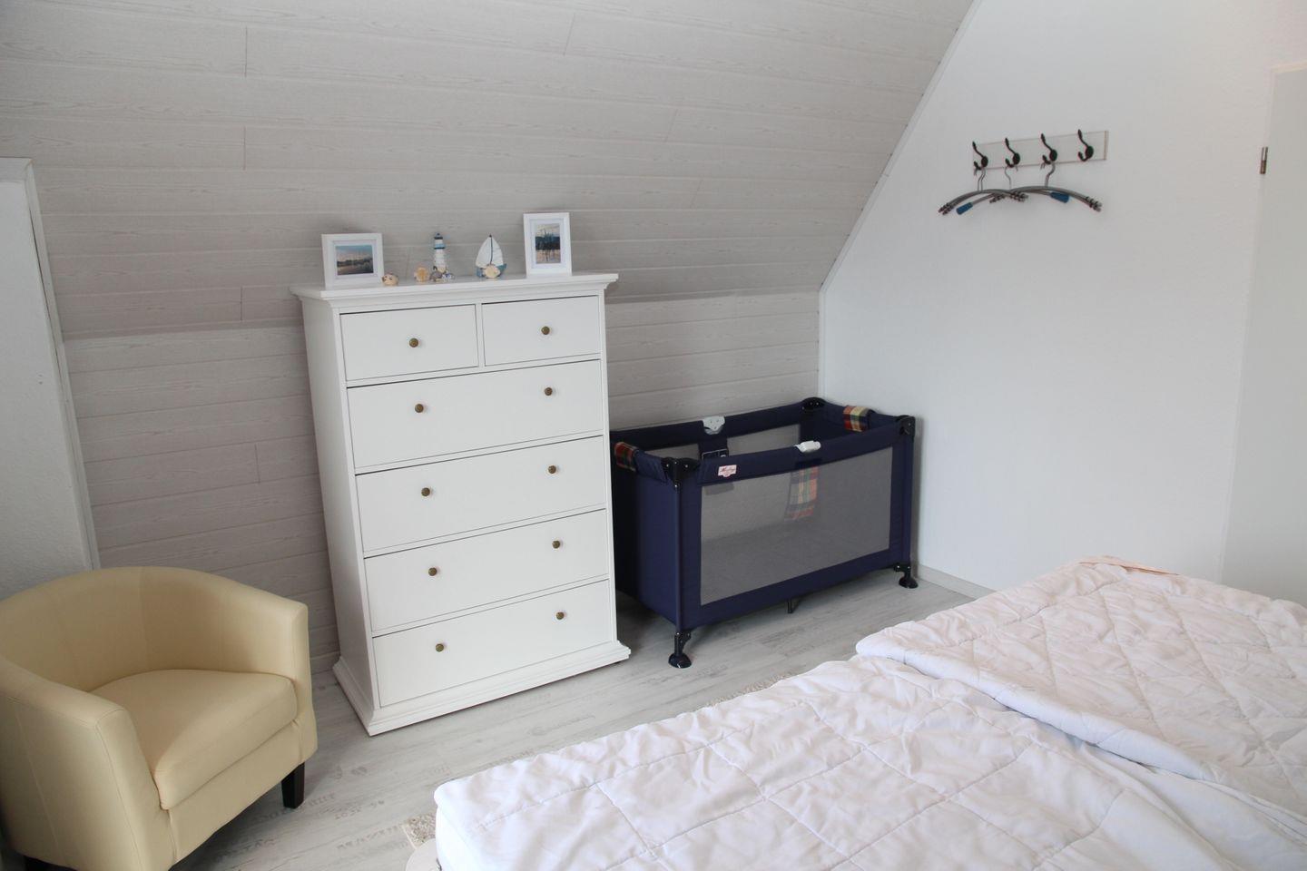 Im Obergeschoss finden Sie zwei weitere Schlafzimmer: Eines mit zwei Einzelbetten und Kleiderschrank, das andere mit einem Doppelbett und Kommode. Hier ist auch noch ein Babybett vorhanden. Ein zusätzliches Gäste-WC mit Waschbecken finden Sie ebenfalls in der oberen Etage.