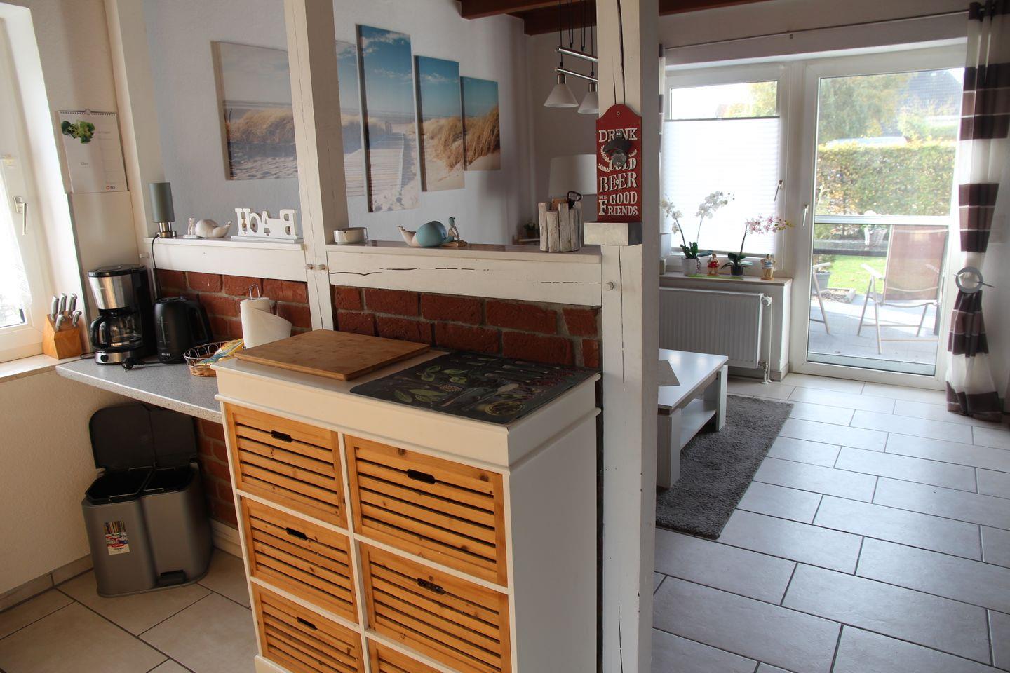 Im Erdgeschoss kommen Sie durch den Hausflur mit Garderobe in den Wohnbereich mit Küche, die über alle wichtigen Ausstattungsmerkmale wie bspw. Kühlschrank, Mikrowelle, Kaffeemaschine, kleinen Backofen, Cerankochfeld, Wasserkocher verfügt. Der Wohnbereich bietet ein gemütliches L-Sofa, einen großen Flachbildfernseher (55 Zoll), einen offenen Kamin und den Esstisch mit vier Stühlen (ein fünfter Stuhl ist im Gästezimmer vorhanden). Vom Wohnzimmer können Sie auch auf die möblierte Terrasse mit Tisch, Stühlen, Sonnenliegen und Sonnenschirm hinaustreten.