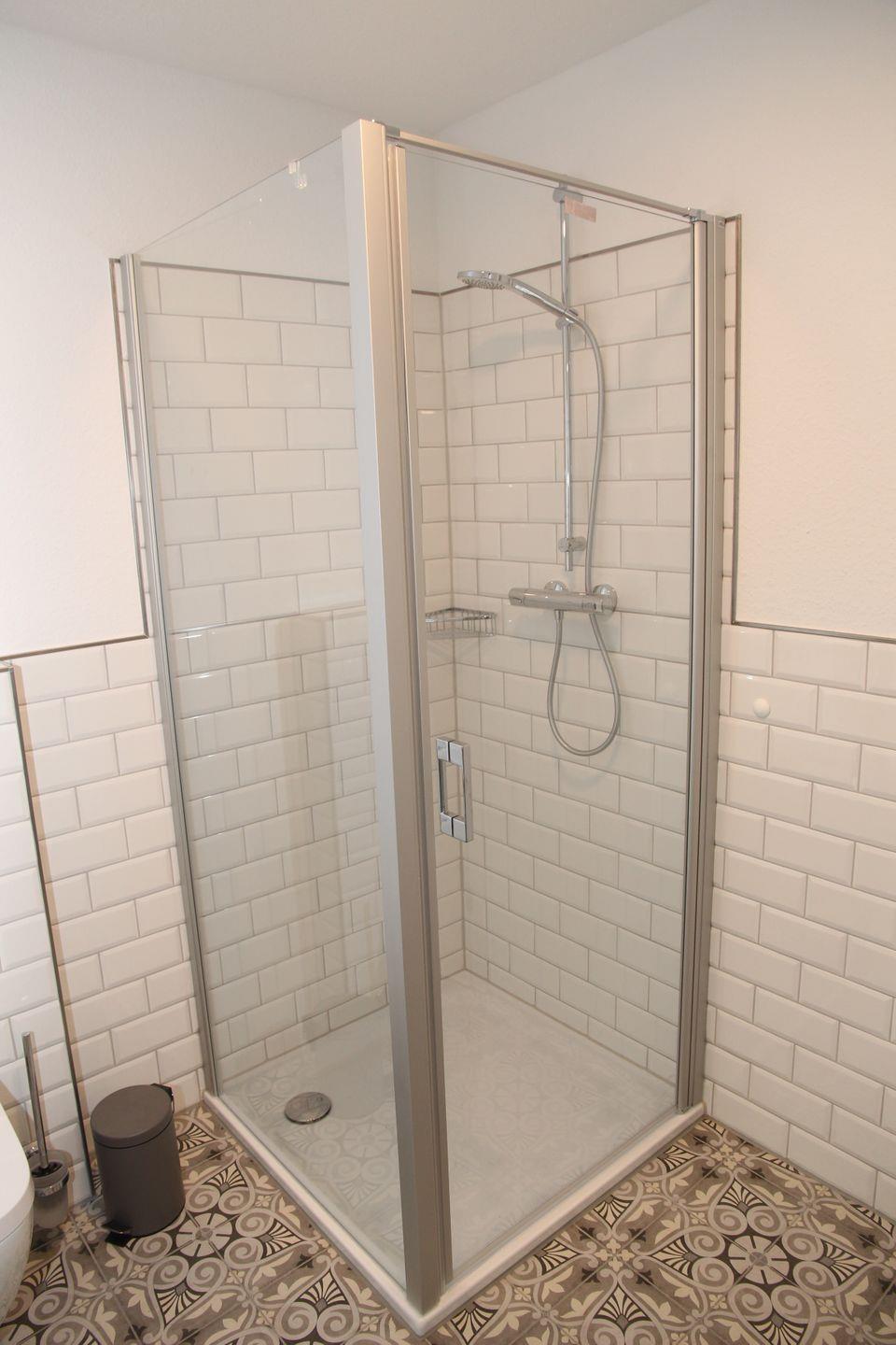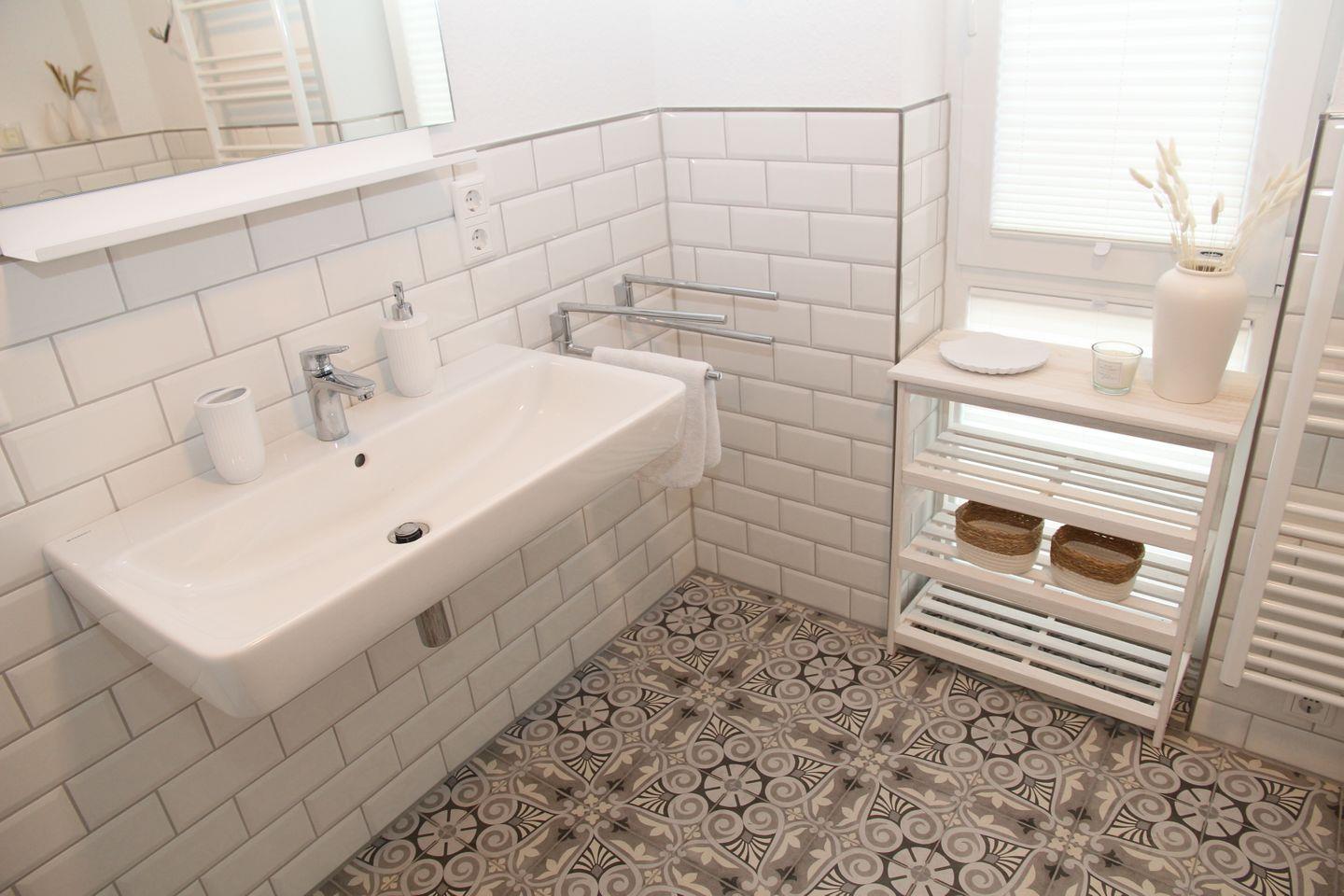Das Badezimmer mit ebenerdiger Dusche, Waschbecken, Handtuchtrockner und Fön ist komplett ausgestattet. Im Abstellraum stehen Ihnen Waschmaschine, Bügelbrett und -eisen zur Verfügung.