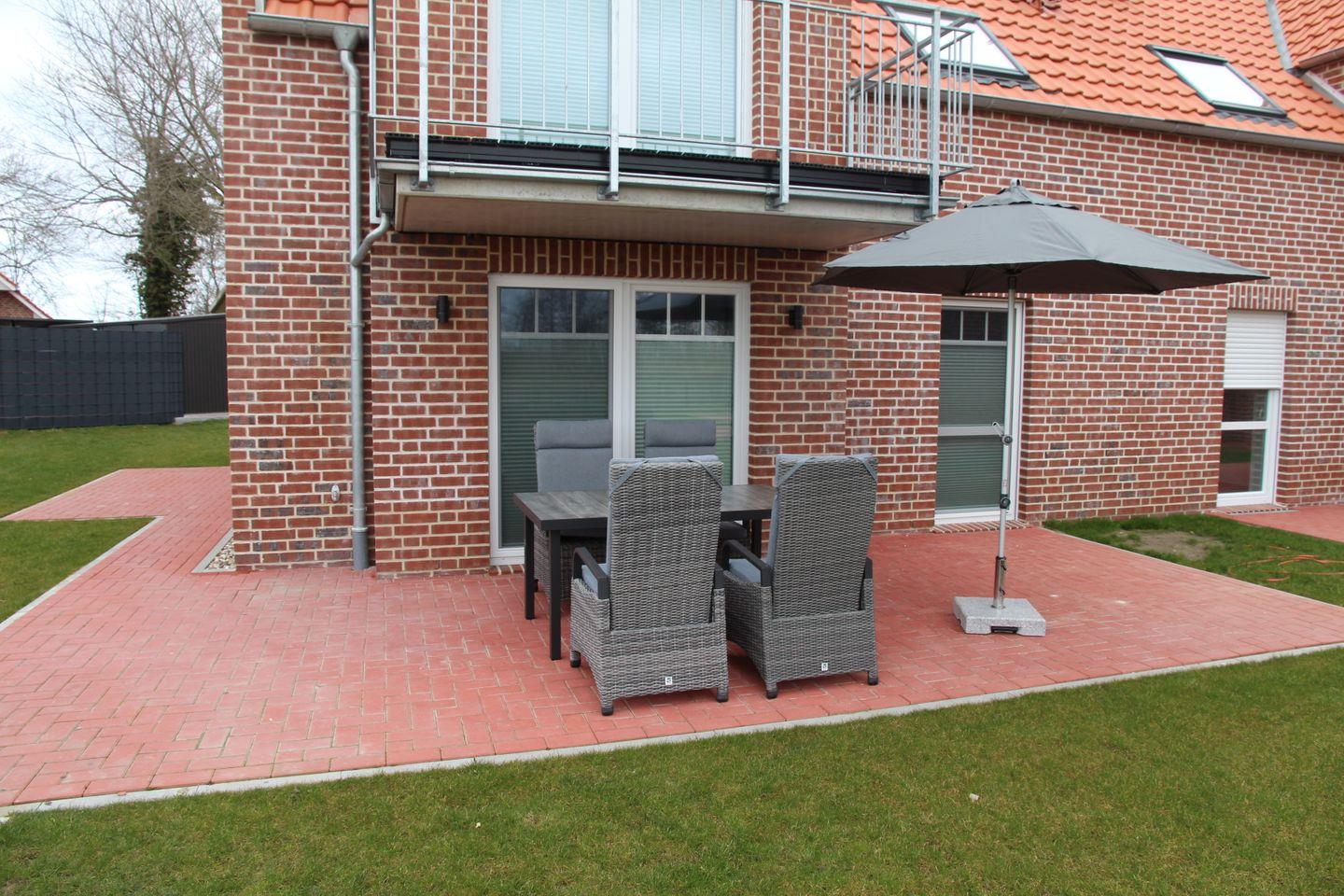 Die sonnige Terrasse ist möbliert mit Tisch, gemütlichen Stühlen und Sonnenschirm, auch ein eigener Rasenbereich und eine zweite Terrasse sind vorhanden.