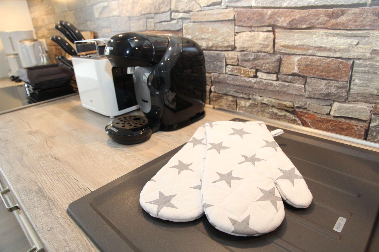 Die Küche ist mit allem ausgestattet, worauf man auch im Urlaub nicht verzichten möchte (Kühlschrank mit Gefrierfach, Bosch Tassimo Kaffeepad-Maschine, Mikrowelle, Toaster, Wasserkocher, Kaffeemaschine, Mixer u.v.m.).