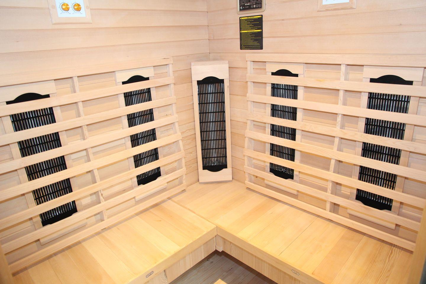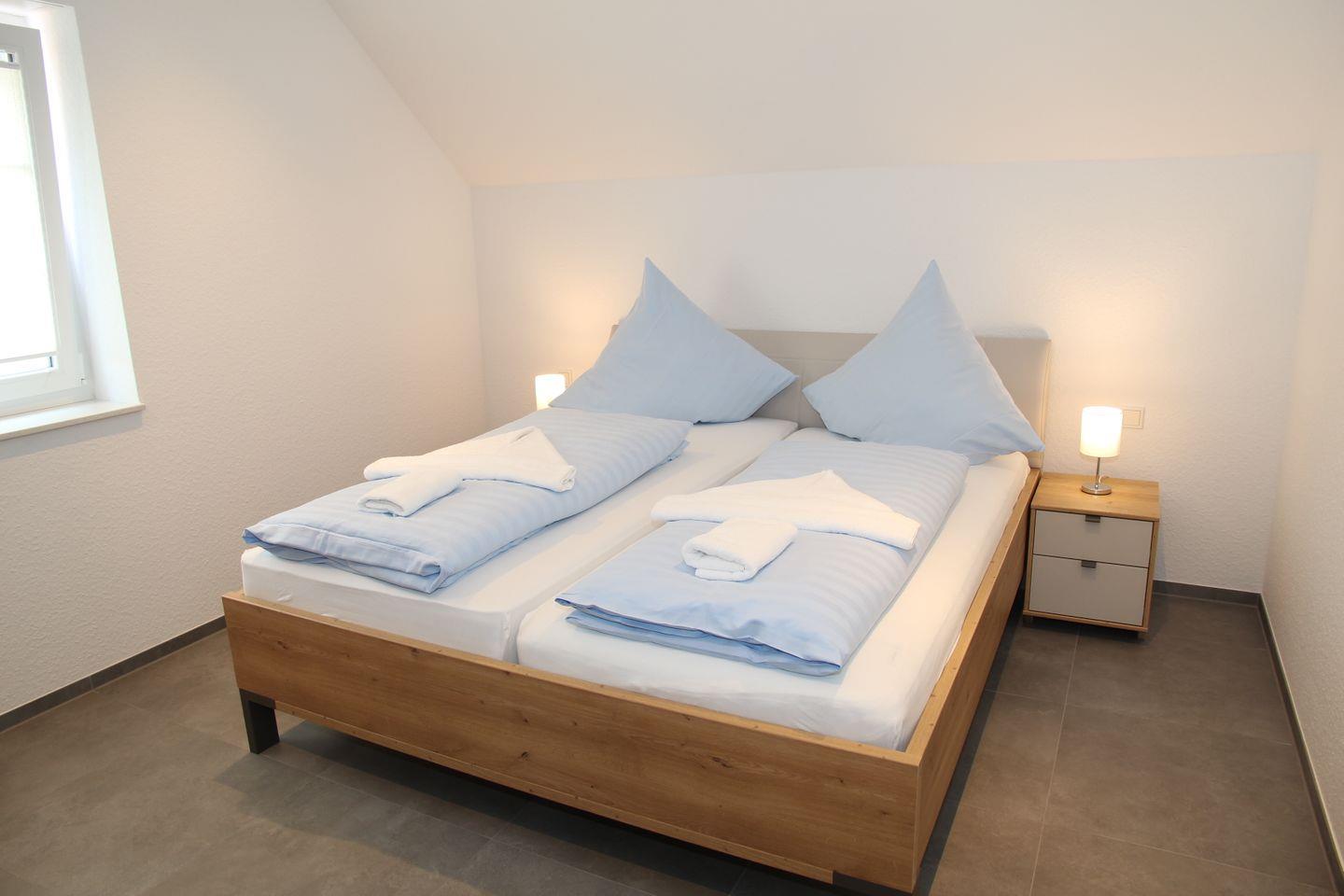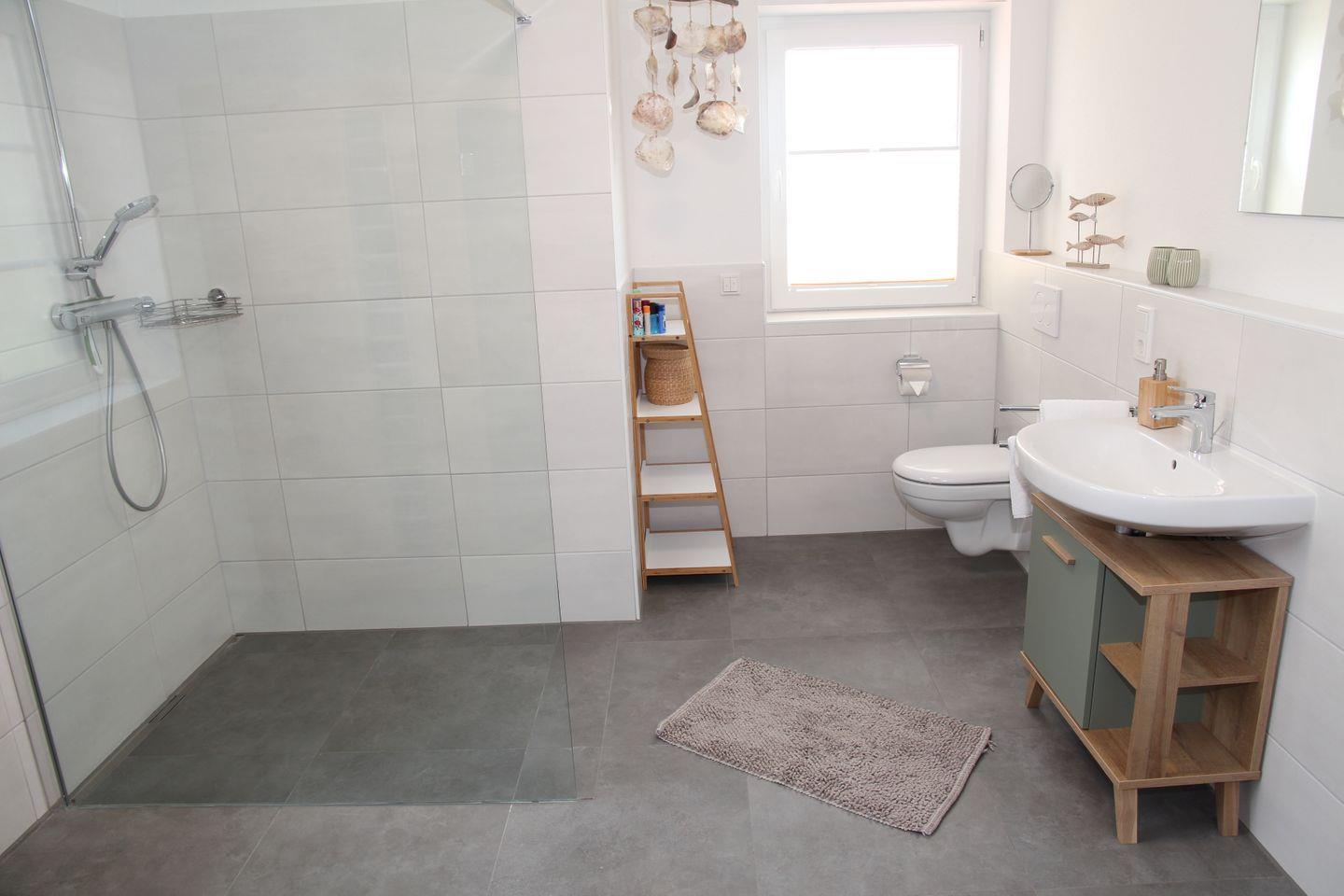 Ebenfalls noch im Erdgeschoss befindet sich ein Schlafzimmer mit Doppelbett, Fernseher und Kommode, sowie das große Badezimmer mit 4-Personen-Infrarotkabine, offener Dusche, Waschbecken und WC.