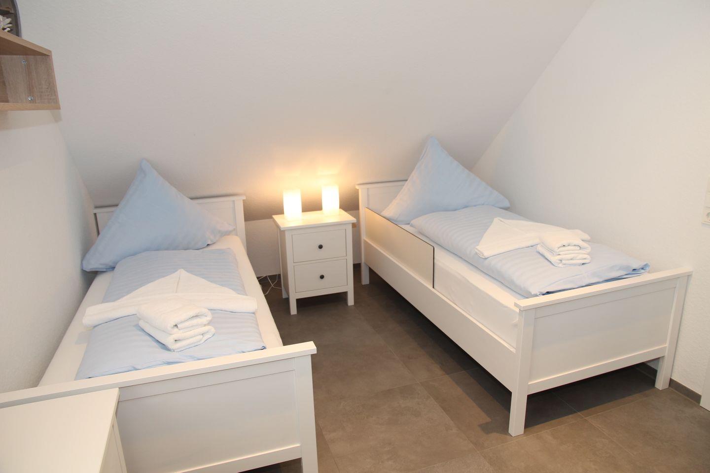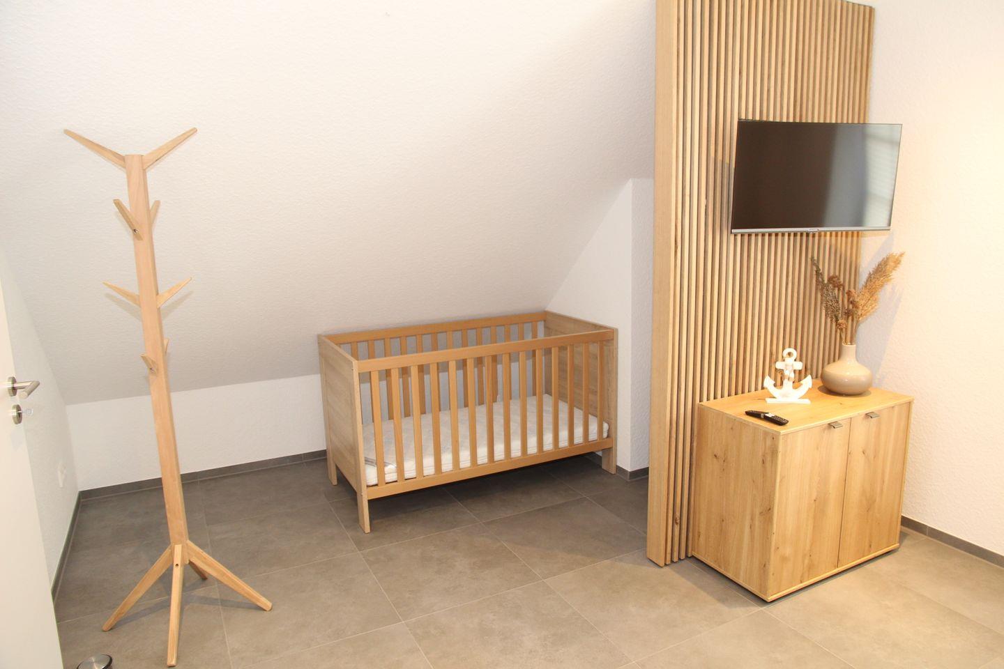 Im Obergeschoss finden Sie zwei weitere Schlafzimmer: Eines mit Doppelbett, offenem Kleiderschrank, Fernseher und Babybett, das andere mit zwei Einzelbetten, Kleiderschrank und einem Schrank mit jeder Menge Kinderspielzeug. Ein zweites Duschbad rundet das Obergeschoss ab.