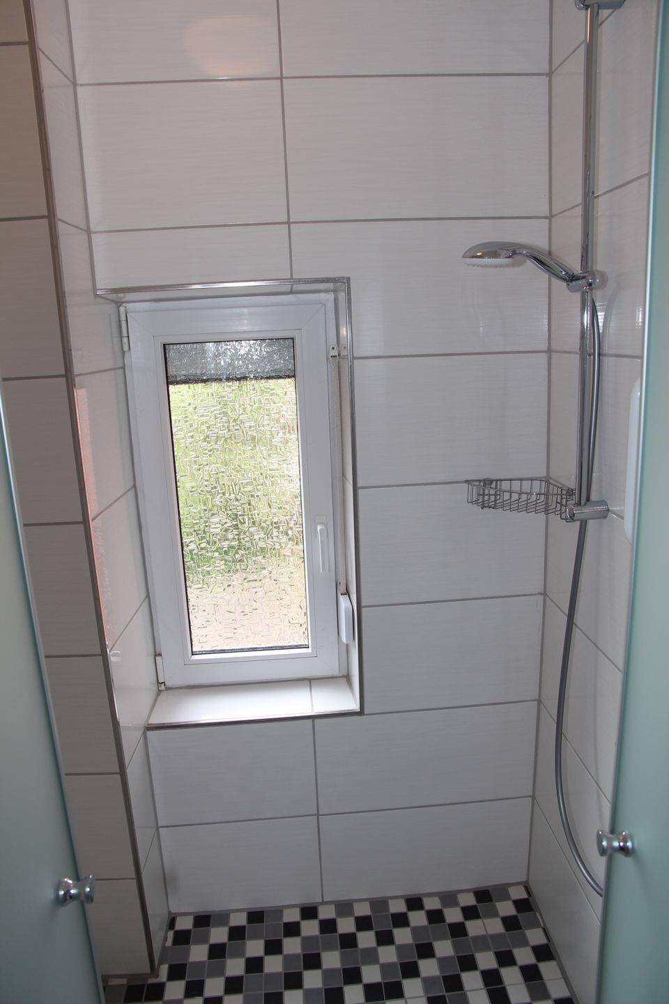 Im ehemaligen Stall, was auch der Eingangsbereich ist, befindet sich ein weiteres Gäste-WC und ein Badezimmer mit Dusche, Waschbecken und Waschmaschine. Dieser Gebäudeteil liegt etwas tiefer als der Rest der Wohnung und ist über ein paar Stufen miteinander verbunden.