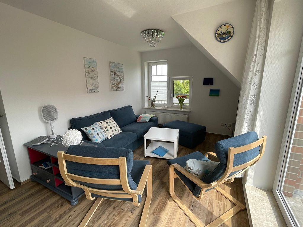 Kommen Sie herein in die im Frühjahr 2023 frisch renovierte Oberwohnung Achterliek! Über einen eigenen Hauseingang erreichen Sie über die Treppe den Flur. Die helle neue Küche lässt keine Wünsche offen und ist voll ausgestattet. Für Kaffeetrinker sind eine Senseo- sowie eine Filterkaffeemaschine vorhanden. Nebenan befindet sich das Schlafzimmer mit Doppelbett und großem Kleiderschrank, das zum Träumen und Entspannen einlädt. Gegenüber liegt das geräumige helle Duschbad. Ideal für Kinder ist das zweite Schlafzimmer ist mit einem Etagenbett ausgestattet. Ein Sekretär und ein Kleiderschrank runden diesen Raum ab. Im großen hellen Wohn-/Essbereich können Sie die Seele baumeln lassen. Auf der gemütlichen Sofa-/Sessellandschaft können schöne Spiele- oder Klönabende verbracht werden. Ein Flachbild-TV, eine Musikanlage mit Bluetooth-Verbindung und Smartphone-Ladestationen sorgen für moderne Technik. Von hier gelangen Sie auf den großzügigen Südbalkon, der mit Gartenmöbeln, Liegestuhl und Sonnenschirm ausgestattet ist. Genießen Sie die frische Nordseeluft und die Sonnenstrahlen. Die Eigentümer haben die Wohnung liebevoll eingerichtet und dekoriert - eine Wohlfühloase! Zur Wohnung gehört ein Schuppen, wo 3 verschiedene Kinder- und 2 Erwachsenenfahrräder zur Verfügung stehen (Benutzung auf eigene Gefahr). Außerdem bietet der Raum noch Platz für 4 weitere Gästefahrräder. Der Parkplatz befindet sich direkt vor dem Haus. WLAN ist verfügbar! Haustiere sind nicht erlaubt.